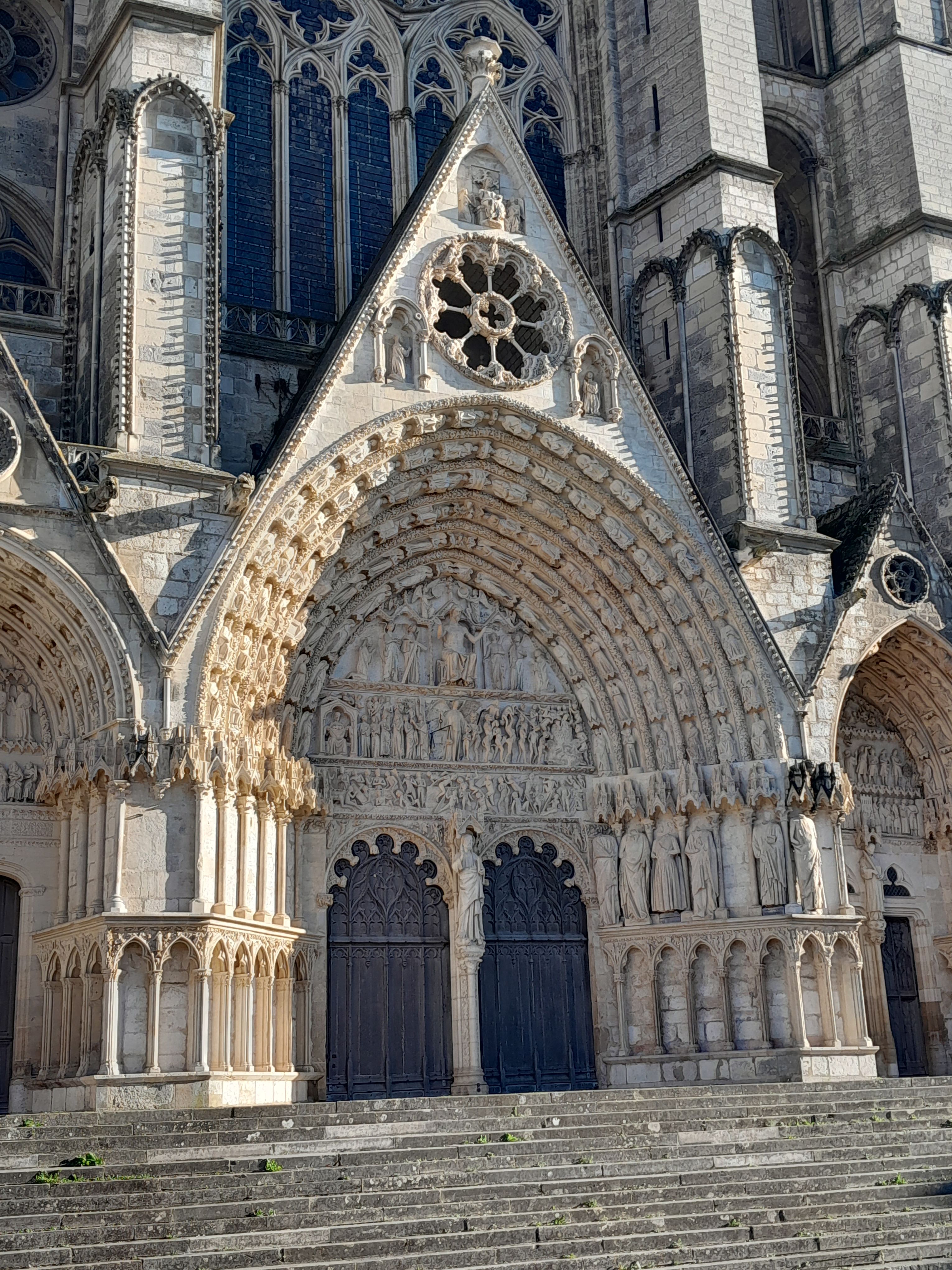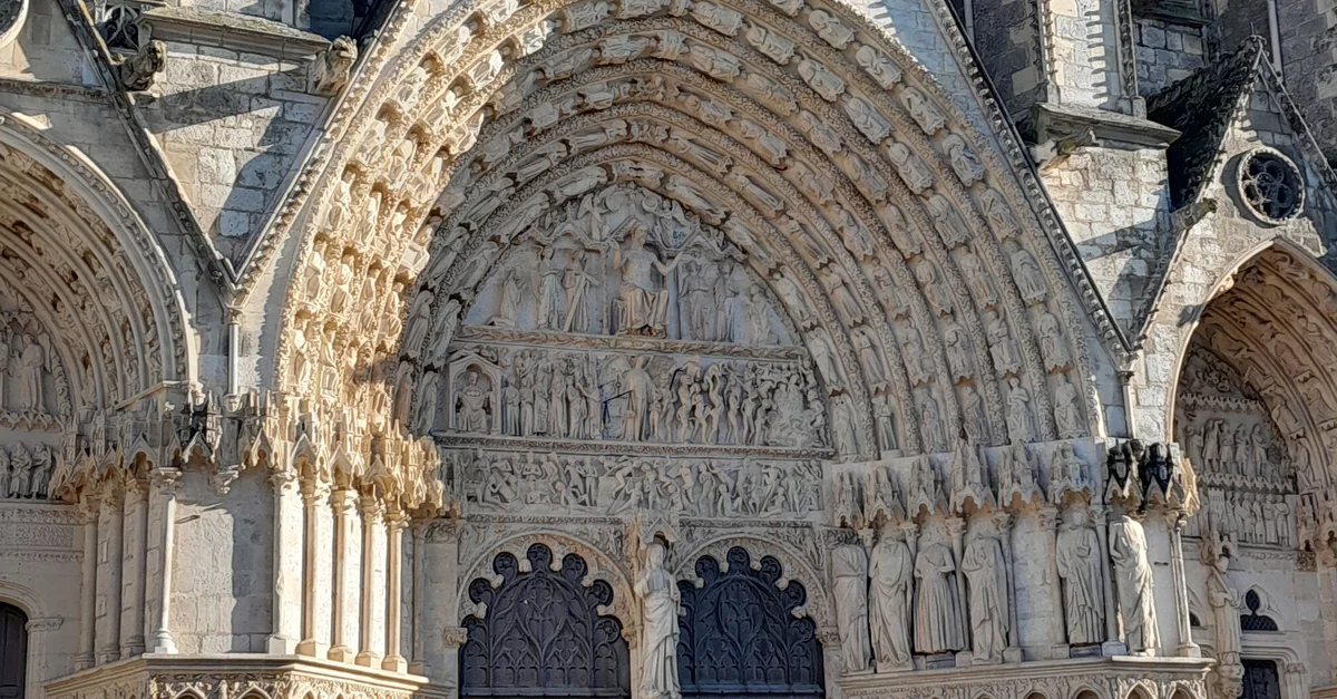 The main portal on the western façade of Bourges Cathedral, France. The sculpture above the two doorways shows the Last Judgement and was made around 1240. The figures in the arches represent various angels, martyrs, confessors, and saints.