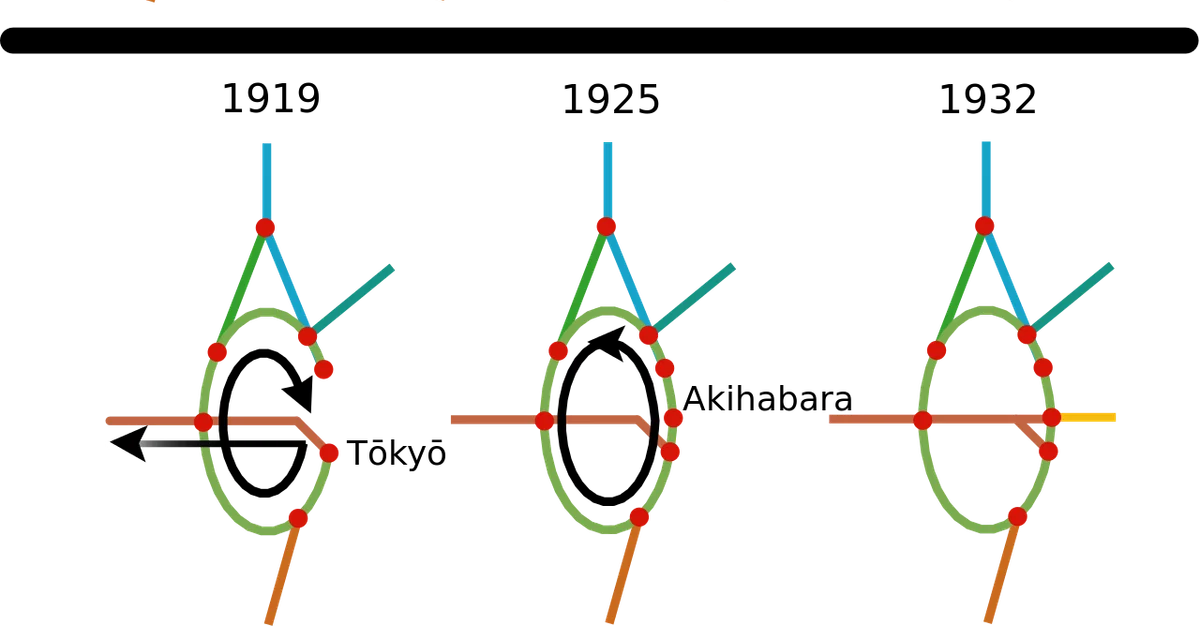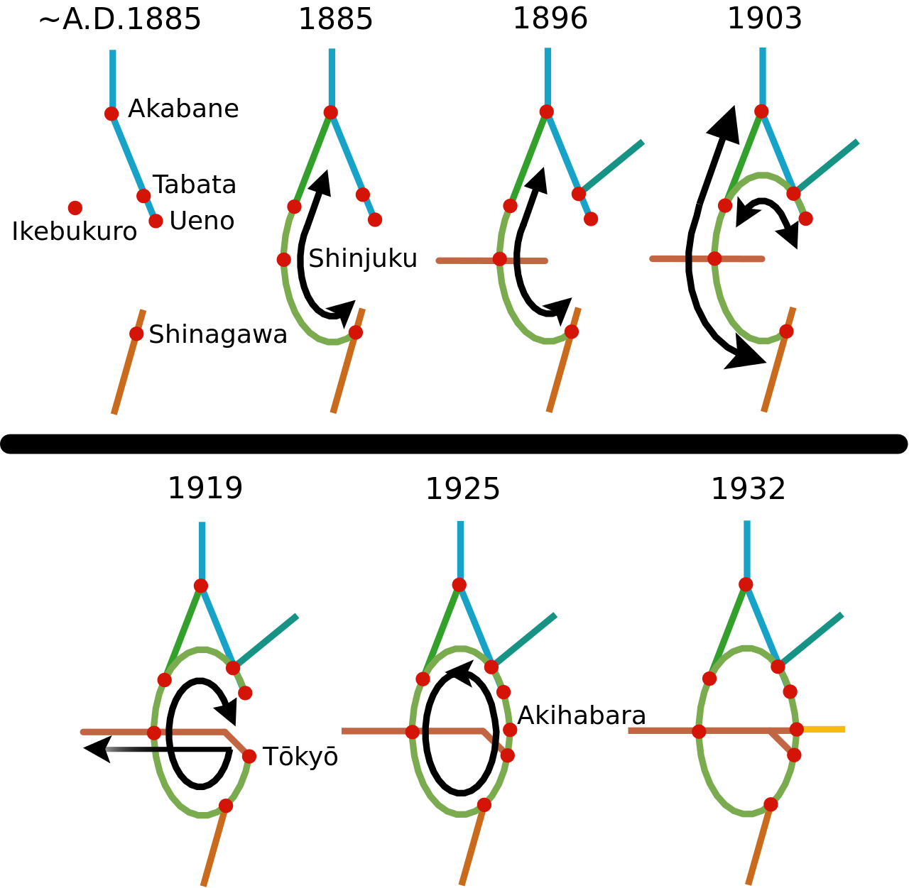 The Yamanote Line is a loop rail line that runs around the central part of Tokyo. This map shows how the line developed over time.