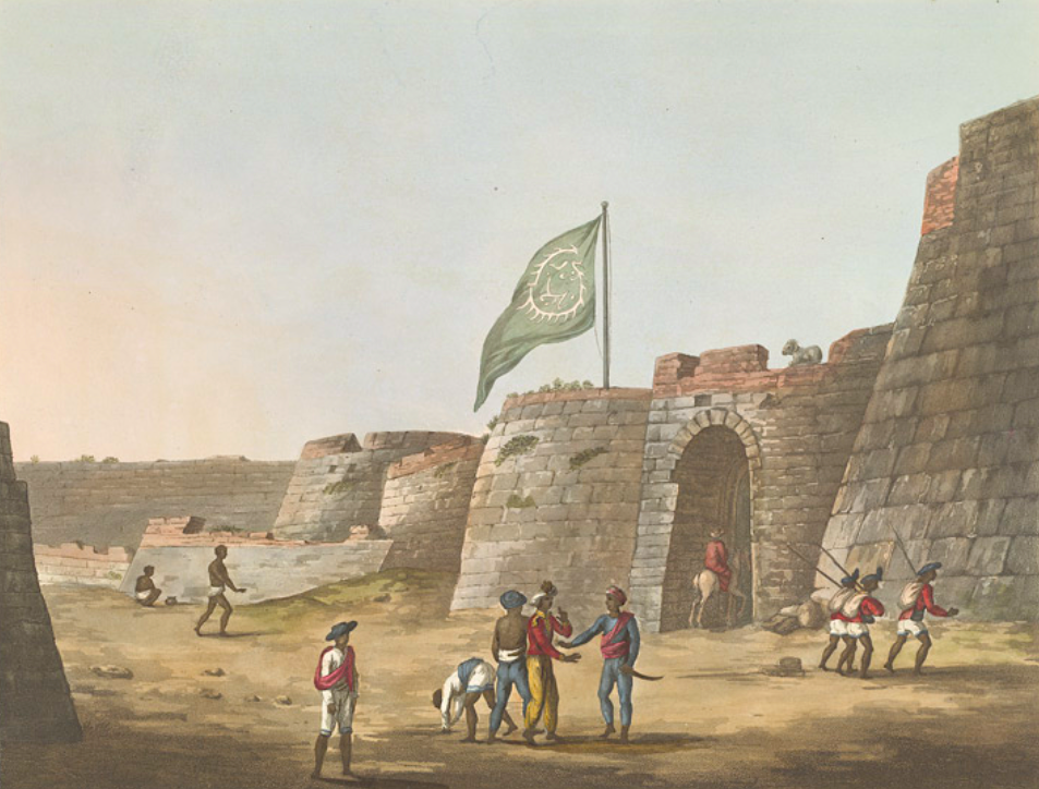 A c. 1804 illustration of Bangalore fort flying the flag of Tipu Sultan (d. 1799), ruler of the Indian state of Mysore.