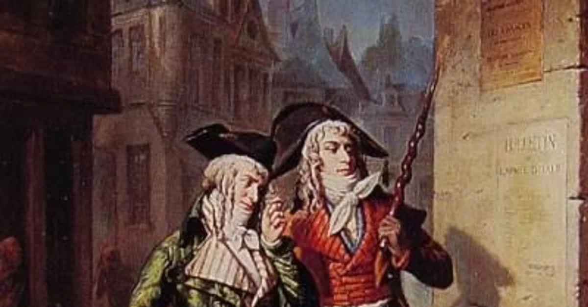 Two dandyish muscadins strolling through the streets of Paris, looking for Jacobins to attack with their wooden clubs (which they nicknamed constitutions). Painting by Eugène Lampsonius.
