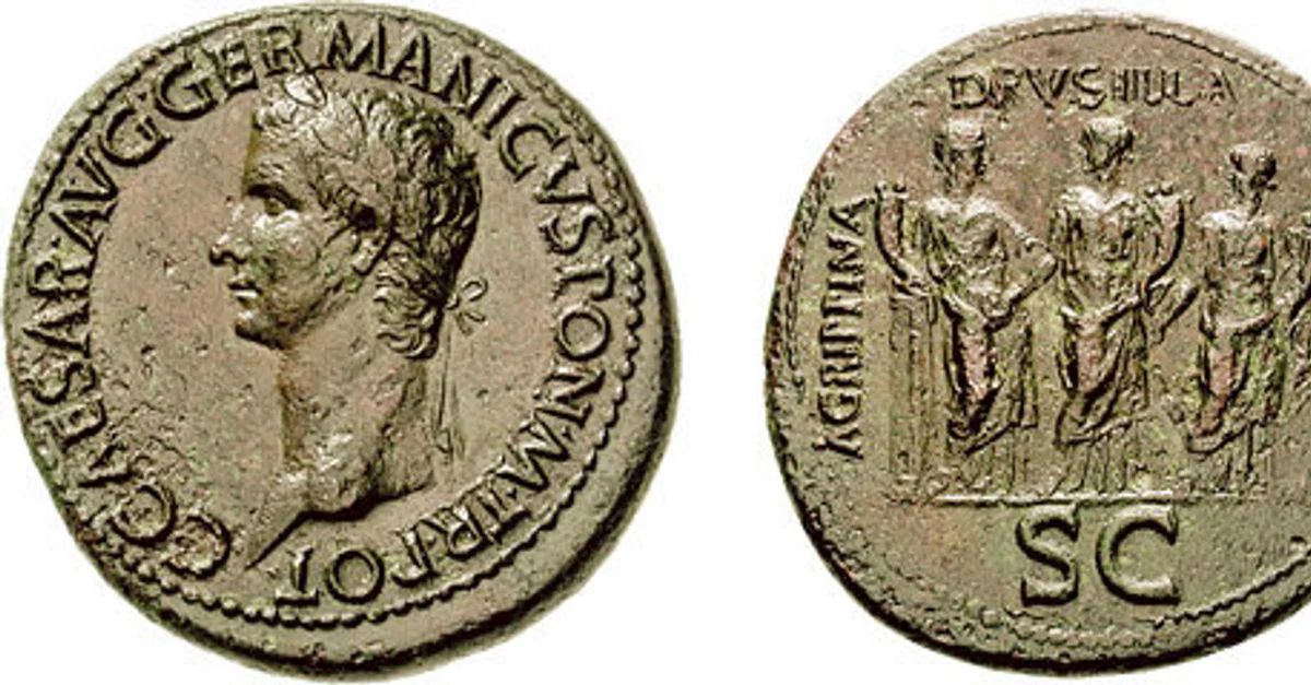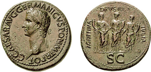 Roman sestertius, minted in Rome, 37-38 CE, under Roman emperor Caligula (r. 37-41 CE).