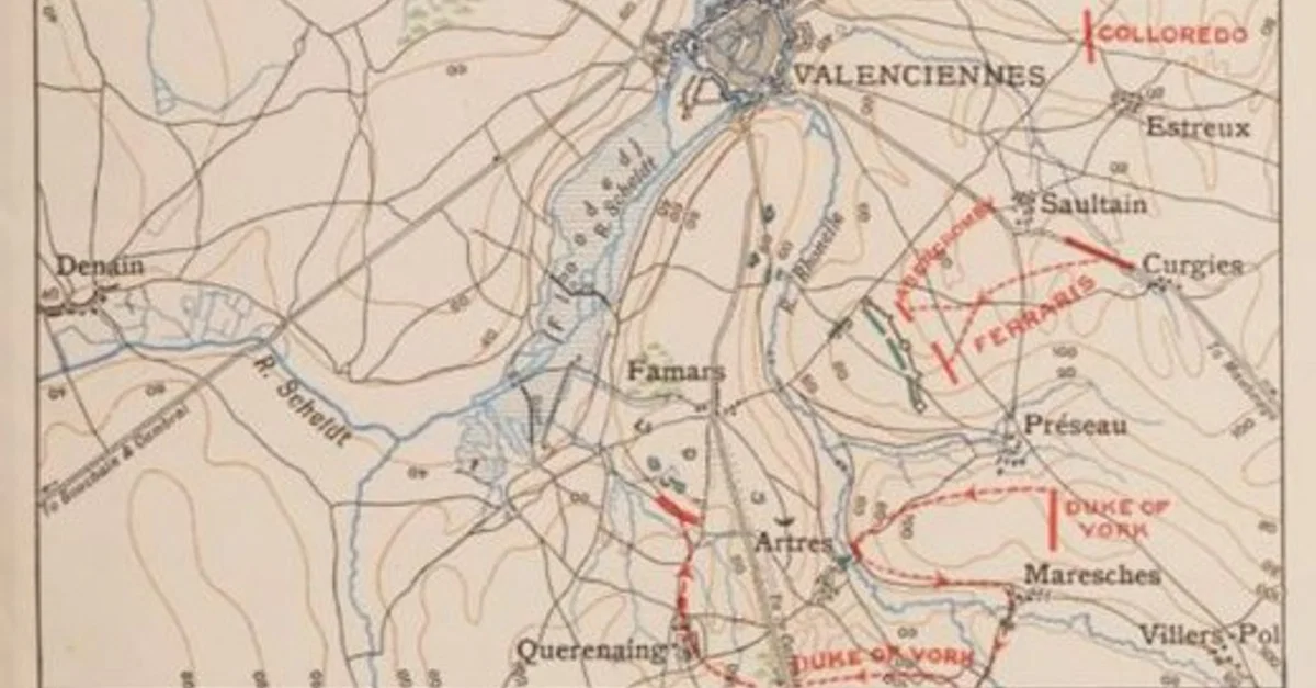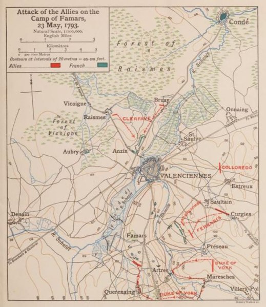 Map showing the Battle of Famars, also showing the woodlands around the towns of Raismes and Vicoigne, where the Battle of Raismes was fought between Coalition and French forces on 8 May 1793. From John Fortescue's History of the British Army Volume IV - Maps and Plans, 1915.