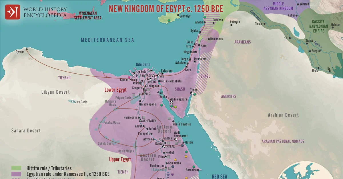 Netchev, S. (2022, December 12). Map of the New Kingdom of Egypt c. 1250 BCE. World History Encyclopedia. https://www.worldhistory.org/image/16773/map-of-the-new-kingdom-of-egypt-c-1250-bce/