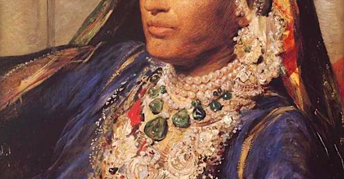 An 1863 portrait of Maharani Jind Kaur who, from 1843, ruled as regent for her infant son Duleep Singh (l. 1838-1893), the last Maharaja of the Sikh Empire which was dissolved after the Anglo-Sikh Wars (1846-9) with the Brtish East India Company.