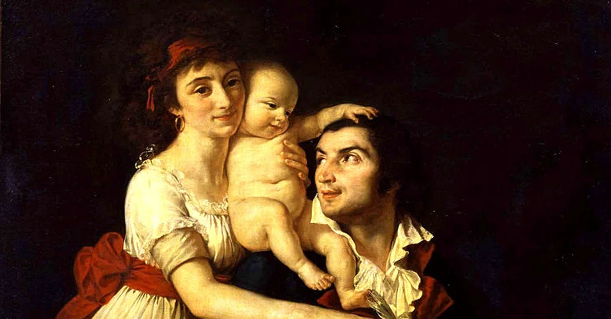 French Revolutionary journalist Camille Desmoulins (1760-1794) spends time with his wife Lucille (1771-1794) and child Horace-Camille (1792-1825), oil on canvas, formerly attributed to Jacques-Louis David, c. 1792.