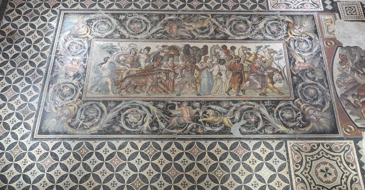 The Indian Triumph of Dionysus mosaic once decorated a dining room (triclinium) in Setifis, a colony for Roman veterans founded during the reign of Nerva (r. 96-98 CE). The central panel of the mosaic depicts the triumphal return of Dionysus from his conquest of India. The god is shown riding a chariot pulled by two tigers. He is surrounded by prisoners, maenads, satyrs, and exotic animals. The mosaic is dated to the early 4th century CE.