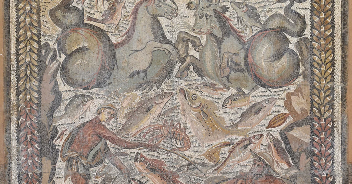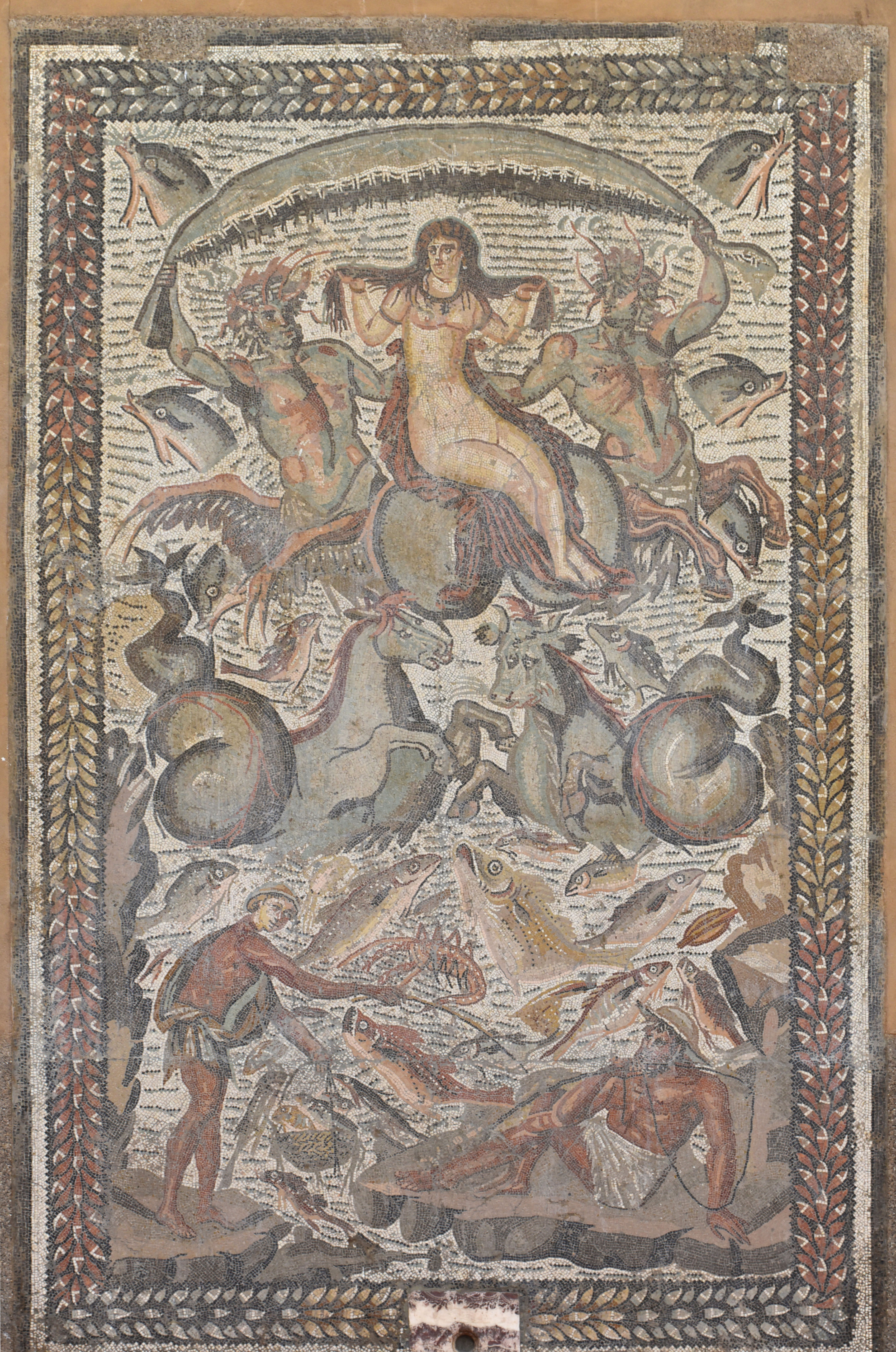 The Triumph of Venus mosaic was found at Khenchela (ancient Mascula, a Roman colony in Numidia) in Algeria. Venus is supported by two marine centaurs. Below are a hippocamp, a marine bull, and a fishing scene in which a fisherman lies on a rocky coast, looking at the catch of his companion. The mosaic dates to the early 4th century CE. National Museum of Cirta, Constantine.
