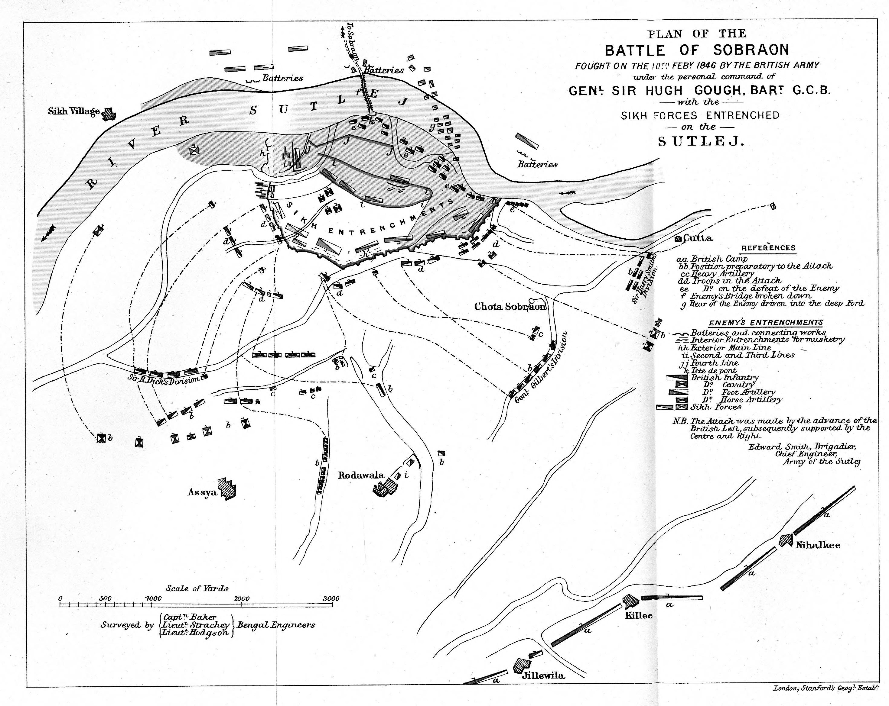 A map showing the troop formations at the Battle of Sobraon on 10 February 1846 during the First Anglo-Sikh War (1845-6). Sobraon was the last of four major victories for the British East India Company (EIC) against the Sikh empire and so the company won the war.