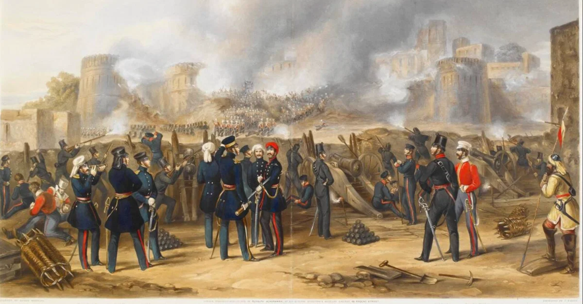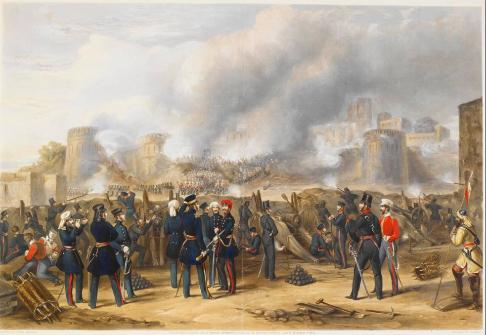 A mid-19th-century illustration showing the siege of Multan by the British East India Company during the Second Anglo-Sikh War (1848-9) against the Sikh Empire.