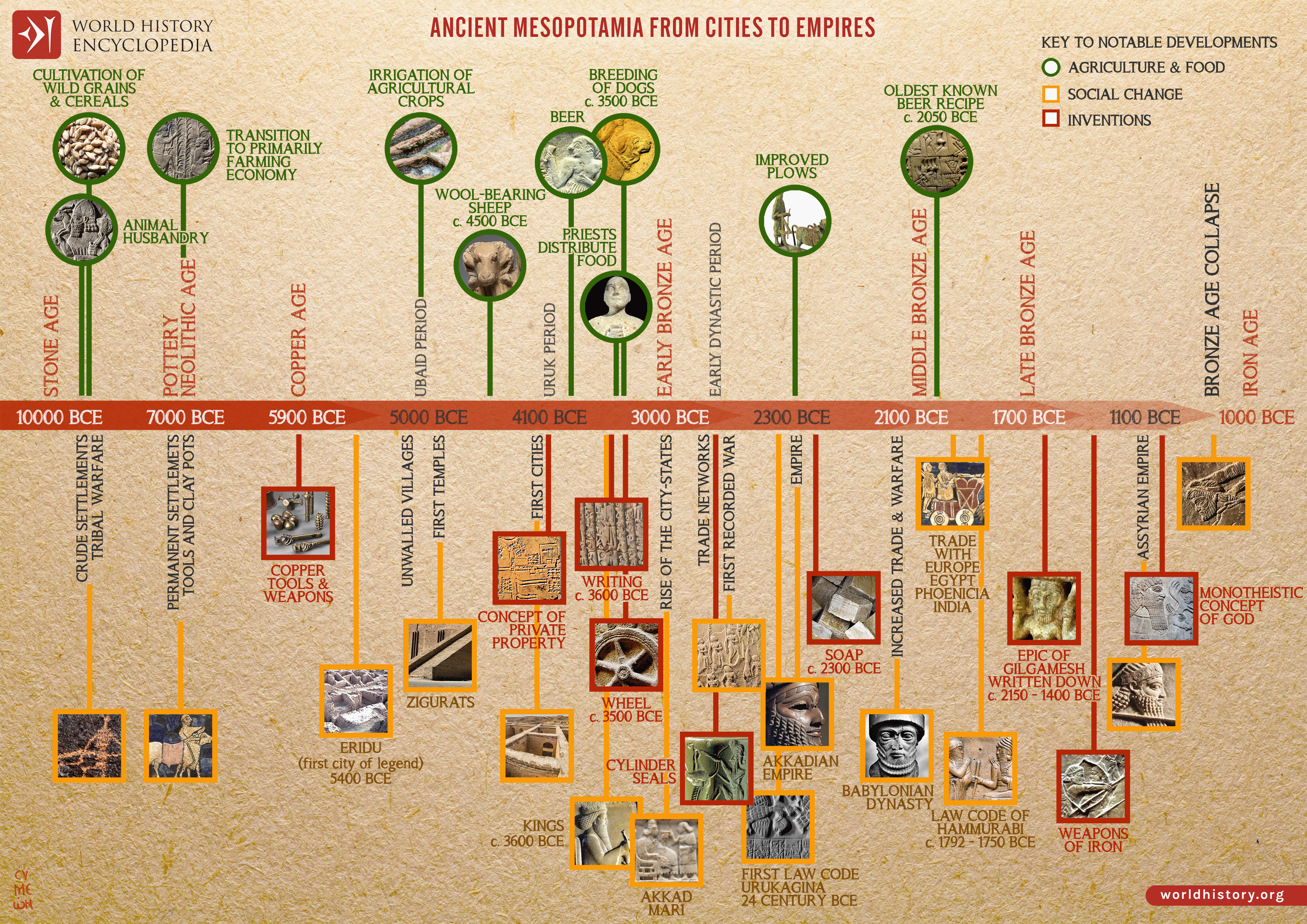 The long-term development of Mesopotamia traces one of the earliest and most influential trajectories in world history, spanning from small Stone Age settlements (c. 10,000 BCE) to the political and cultural upheavals of the Late Bronze Age collapse (c. 1200 BCE). In this region between the Tigris and Euphrates, environmental opportunity and human adaptation combined to produce transformative breakthroughs in agriculture, technology, and social organization. Innovations such as cereal farming, animal domestication, and irrigation enabled permanent settlement, while the emergence of walled villages and property systems laid the groundwork for increasingly complex societies. Over millennia, these developments fostered the rise of some of the world’s earliest urban centers, beginning with Eridu (c. 5400 BCE), alongside monumental architecture, administrative recordkeeping, and technologies such as writing (c. 3600 BCE) and the wheel (c. 3500 BCE).