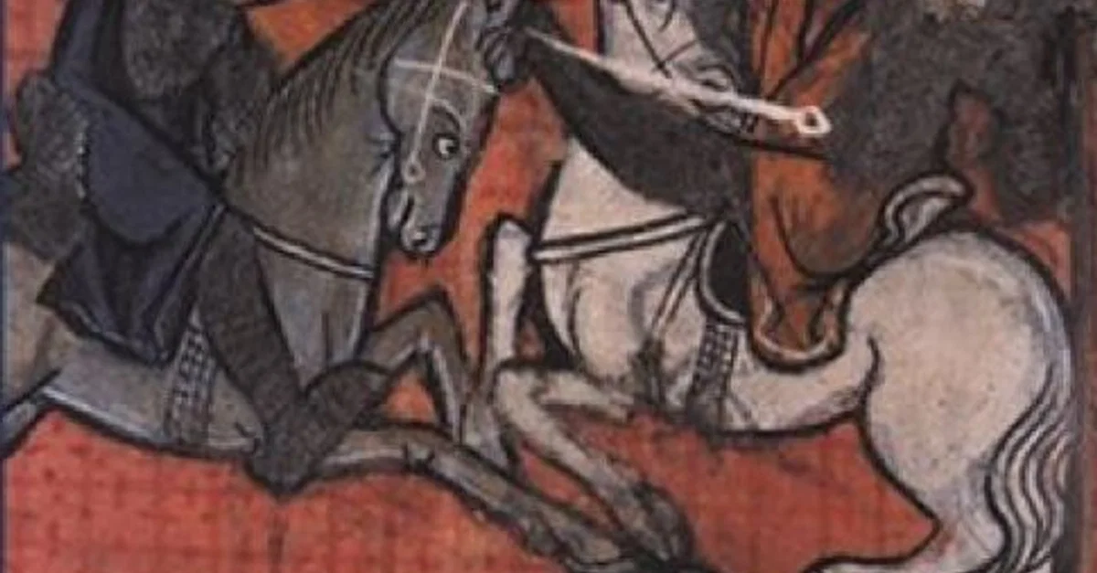 King Baldwin IV of Jerusalem toppling an enemy at the Battle of Montgisard, illustration from MS 45 f. 198r. Estoire d'Eracles (Bk XXI, 27), late 13th century.