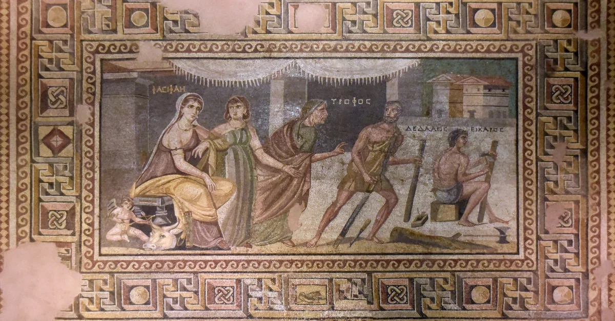 The mosaic of Daedalus, Icarus, and Pasiphaë from Zeugma depicts the wife of King Minos of Crete Pasiphaë (ΦACIΦAH), an unidentified maiden, and her nanny Trophos (TPOΦOC) watching as Daedalus (ΔΕɅɅΟC) and his son Icarus (ΕIKAPOC) make a wooden effigy of a cow. Dated to the end of the 2nd century CE.