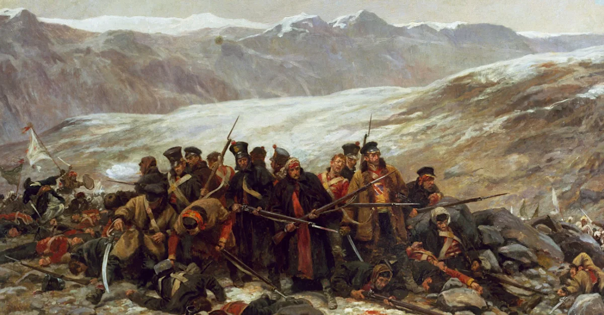 An 1898 painting by William Barnes Wollen, 'The Last Stand', depicting the last stand of the British East India Company's disastrous Retreat from Kabul, 1842.