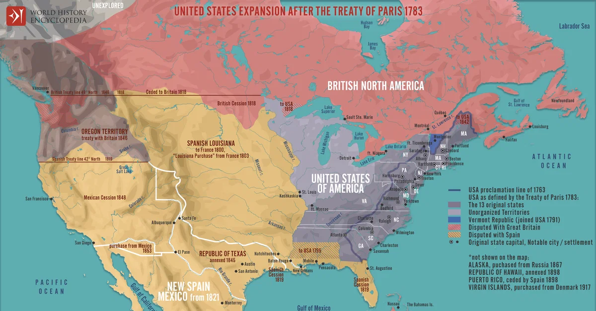 This map illustrates the expansion of the United States from the Treaty of Paris (1783) to the mid-19th century, a period in which the young republic transformed from thirteen coastal states into a nation spanning the breadth of North America. In just a few decades, the country more than quadrupled its territory, pushing its western frontier from the Mississippi River to the Pacific Ocean.