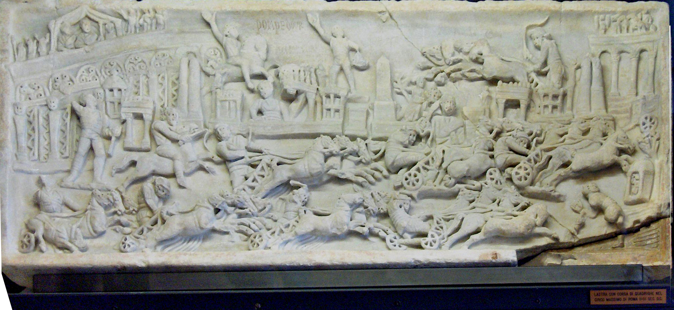 A releif showing a quadriga race in the Cricus Maximus, Rome (2-3rd century); Trinci Palace, Foligno, Italy. The starting gates can be seen on the far left. The upper left-hand corner shows the magistrate who will begin the race by dropping a white handkerchief, Mappa, onto the track. The horator can also be seen shouting instructions to the drivers. A crash is clearly depicted in the left-hand corner.