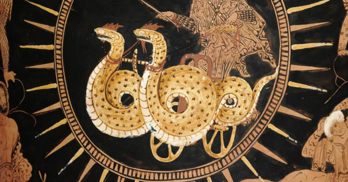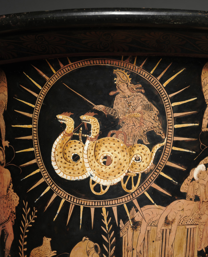 Medea flying on her chariot, red-figure calyx-krater (mixing vessel), South Italian, Lucanian, c. 400 BCE.
