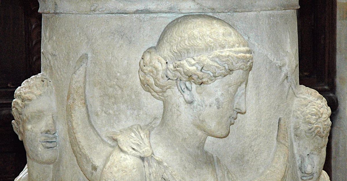 The moon goddess Selene or Luna accompanied by the Dioscuri, or Phosphoros (the Morning Star) and Hesperos (the Evening Star). Marble altar, Roman artwork from Italy, 2nd century CE.