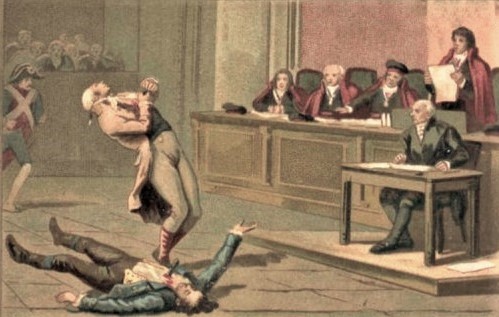 Gracchus Babeuf and Augustin Darthé stab themselves at their trial, after the verdict of death was announced, 26 May 1797. Both survived their injuries only to be guillotined the next day, 27 May. They were thereafter remembered as Jacobin martyrs. Unknown author and unknown date.
