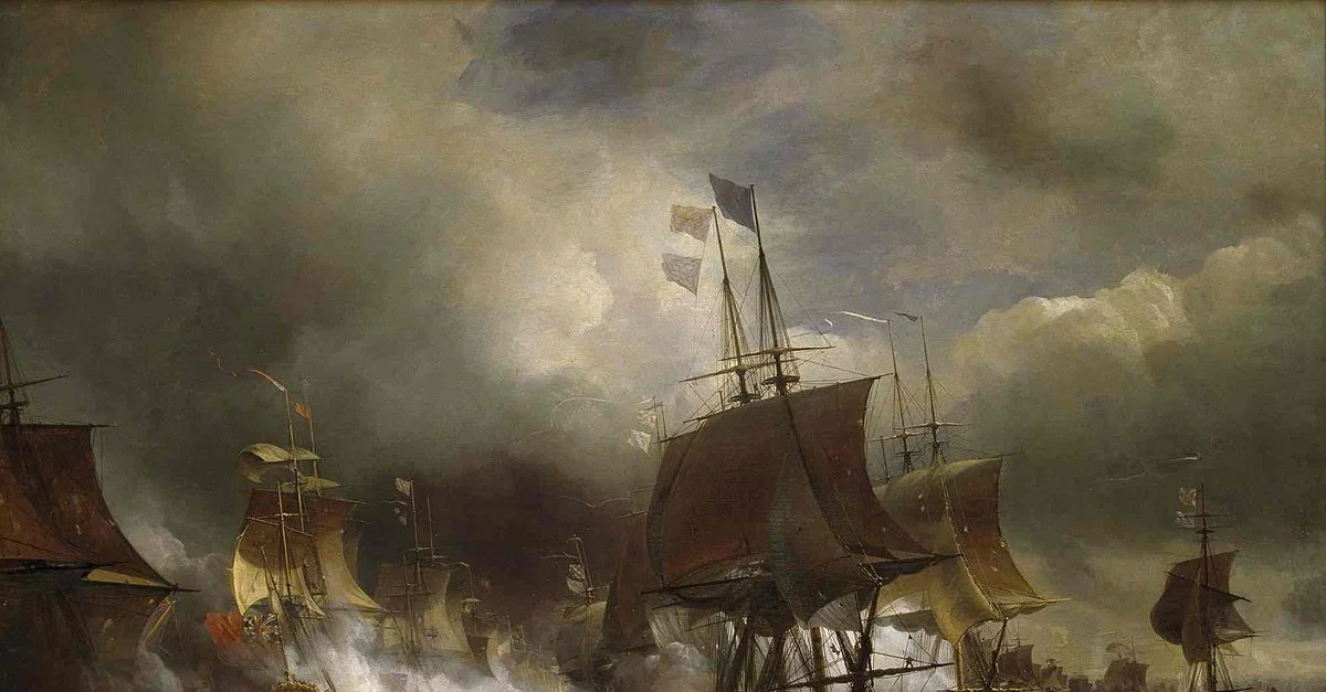 Battle of Ushant between British and French fleets on 27 July 1778, during the American Revolutionary War. Oil on canvas painting by Théodore Gudin, 1839.