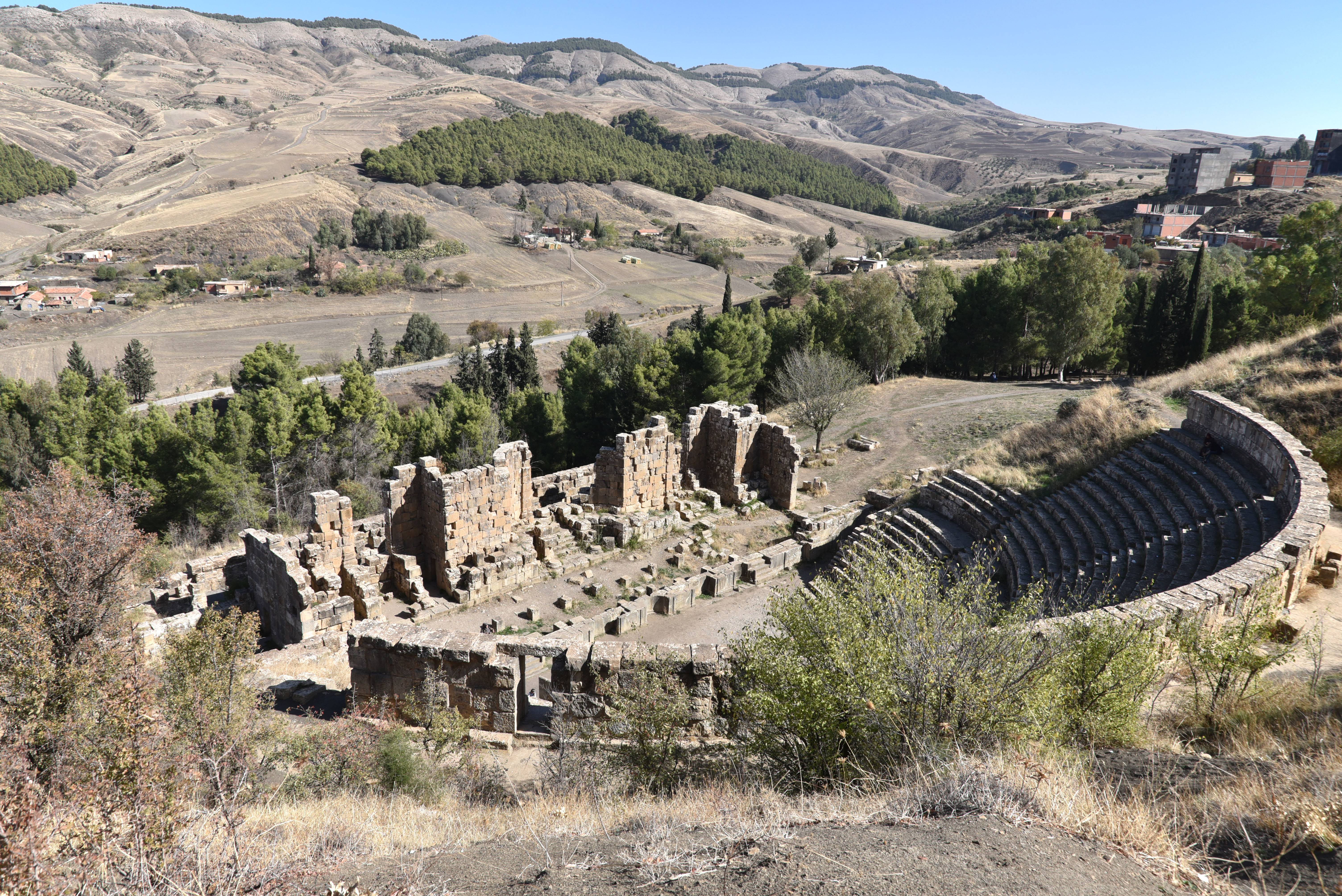 The Roman theatre of Cuicul (Djémila in Algeria) was constructed into the side of the hill overlooking the valley in the 2nd century CE. Its two tiers of seats could have accommodated 3,000 spectators.