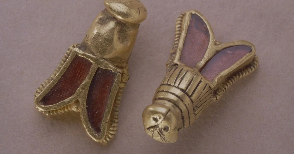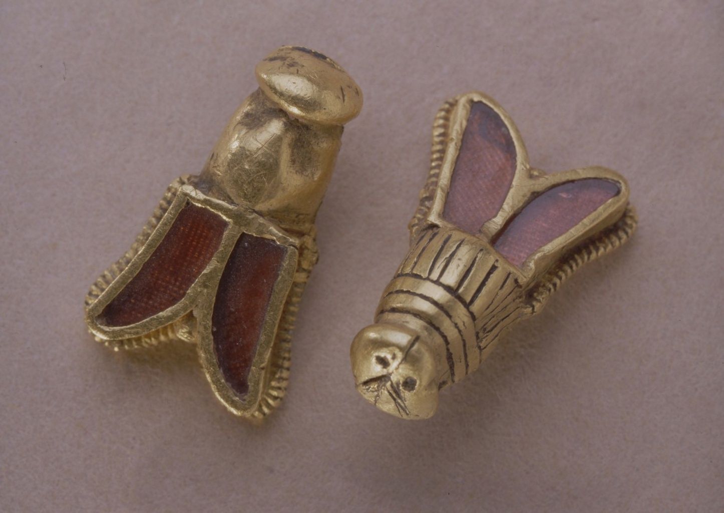 Gold bees of King Childeric I (r. c. 458-481). The head and thorax are gold, the wings are encrusted with garnets. On the reverse, a clip.