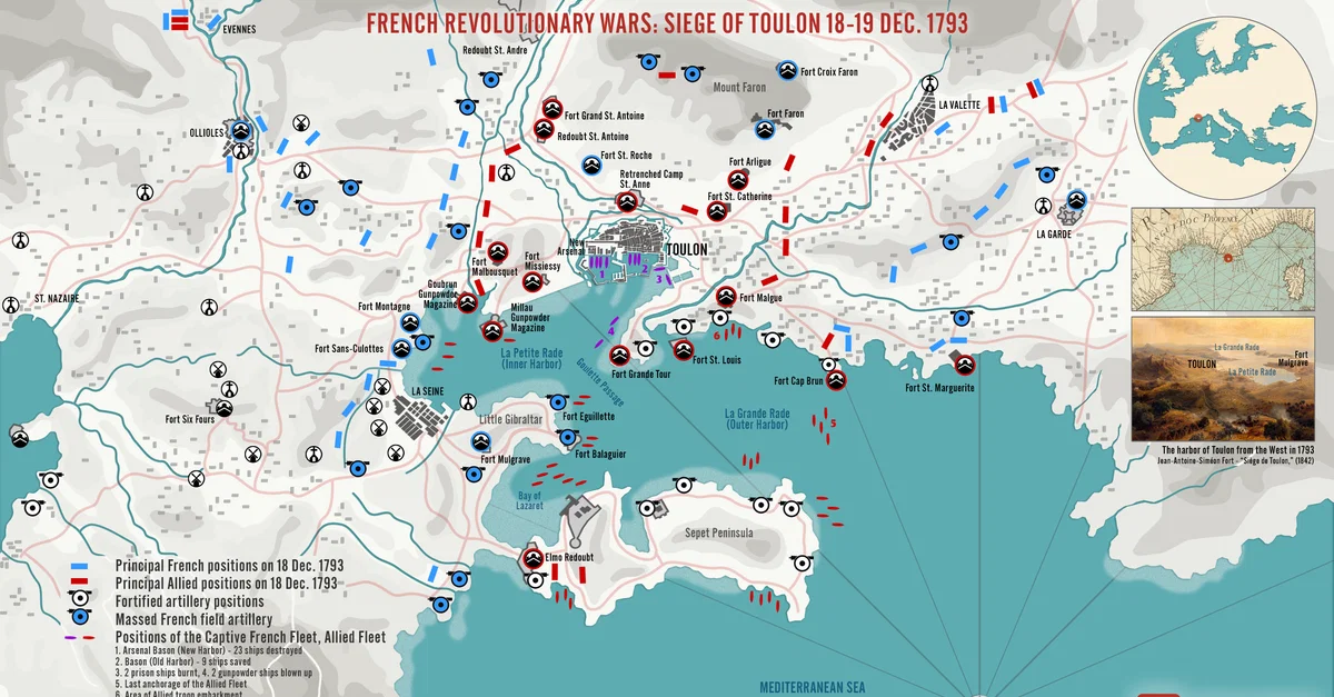 This map illustrates the final stage of the Siege of Toulon (August 28–December 19, 1793), one of the early defining campaigns of the French Revolutionary Wars. The operation not only secured a vital naval base for the French Republic but also launched the career of a young artillery officer, Napoleon Bonaparte (1769–1821), who at just 24 years old played a decisive role in the victory.
