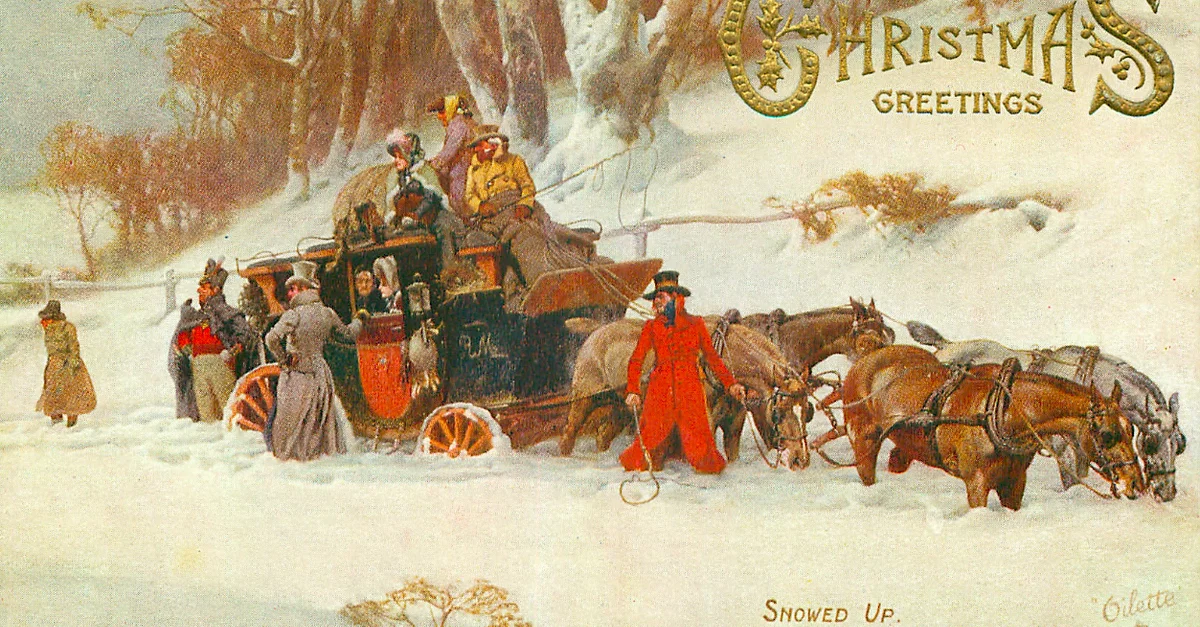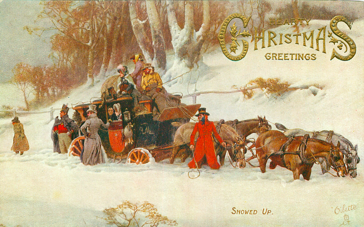 A 19th-century Christmas card showing the perils of stagecoach travel in winter. From an original painting by Gilbert Wright.