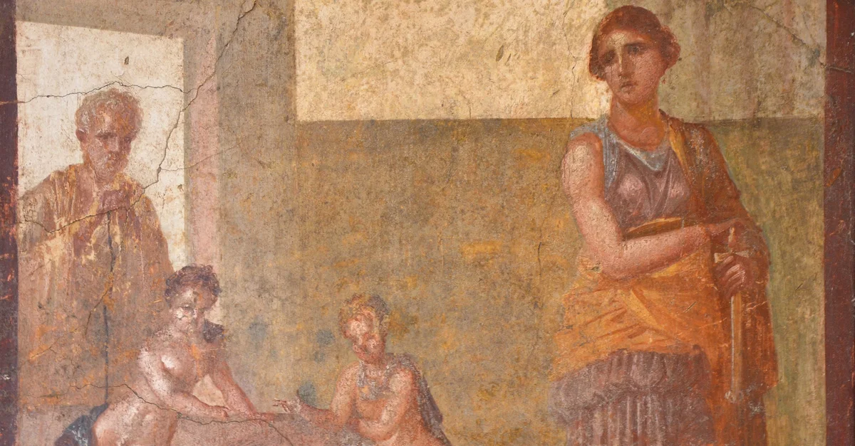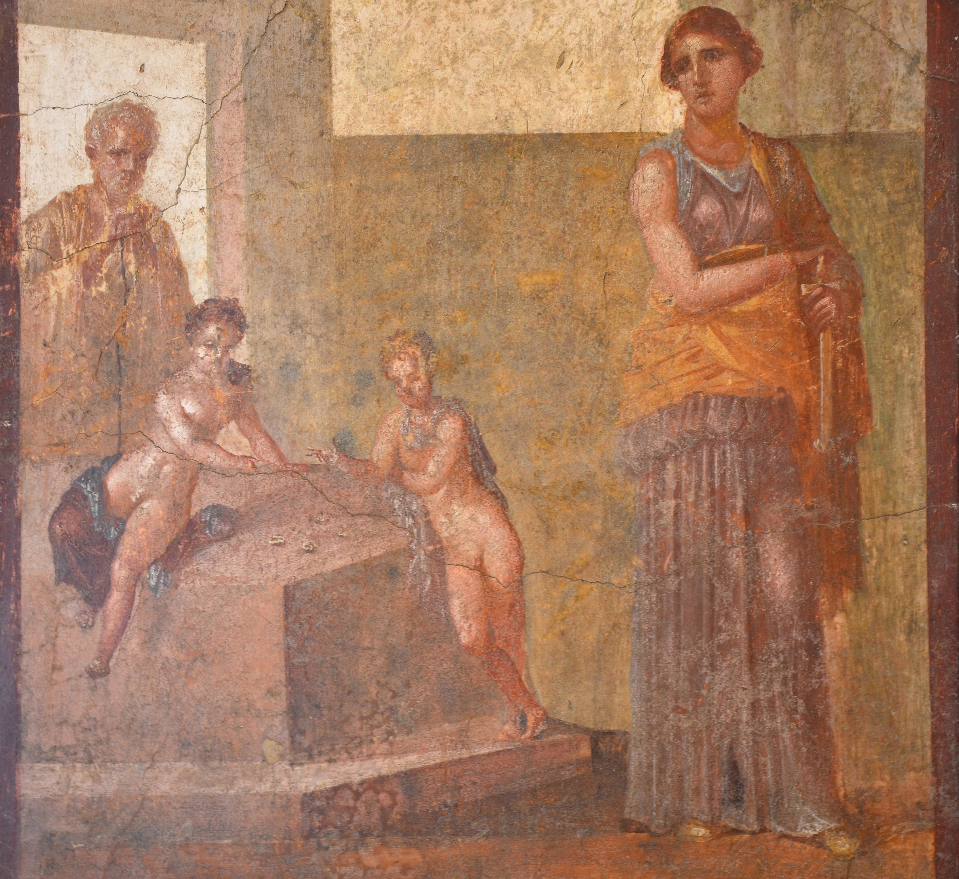 Wall painting depicting Medea just before murdering her children. Discovered in the peristyle of the House of the Dioscuri in Pompeii. 1st century CE.