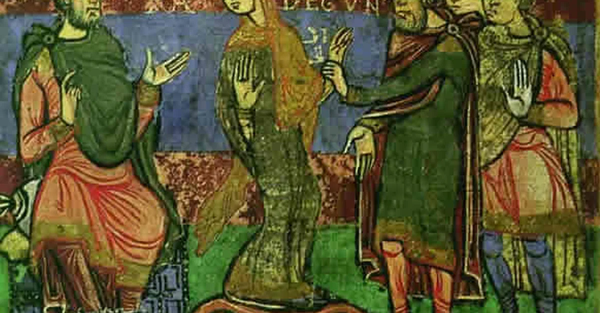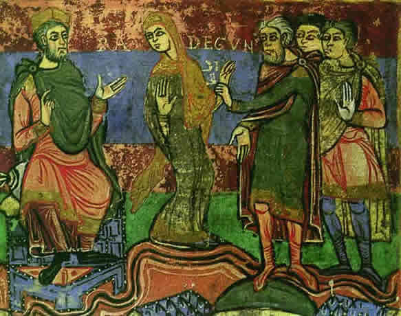 Radegund, niece of the King of Thuringia, is brought before King Chlothar I (r. 511-561), ruler of the Frankish kingdom of Soissons. Chlothar would take Radegund back to Soissons as his spoil of war, and would later make her one of his wives. Illustration by an unknown artist from an 11th-century manuscript.