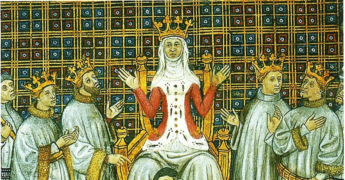 Queen Clotilde (center) presides over the division of Clovis I's kingdom between his four sons (Theuderic I, Chlodomer, Childebert I, and Chlothar I) who are gathered around her.
