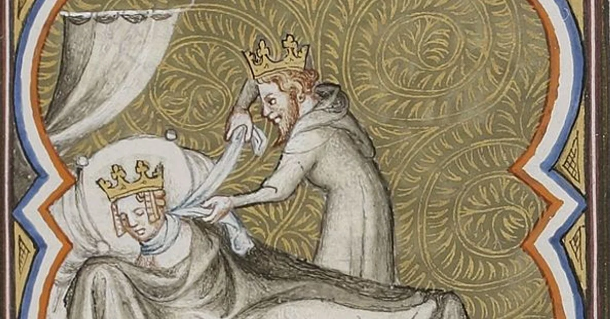 Chilperic I (r. 561-584) strangles his wife, Queen Galswinth, in her bed. Illustration from the Grandes Chroniques de France, between 1375-1380.