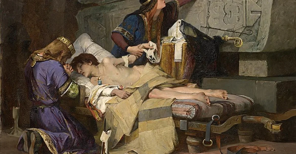 Death of Clodobert, the young son of King Chilperic I and Queen Fredegund. Clodobert and his brother Dagobert died of dysentery in 580, depriving Chilperic of suitable heirs. Chilperic and Fredegund are depicted praying as their son lies dying. Painting by Albert Maignan, 1880.