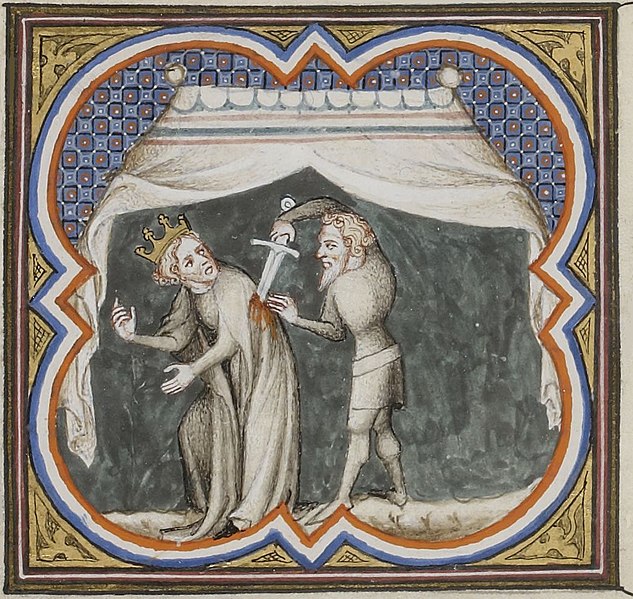The assassination of King Sigebert I of Austrasia in 575, probably on the orders of Queen Fredegund of Nuestria. Illustration from the Grandes Chroniques de France, FR 2813