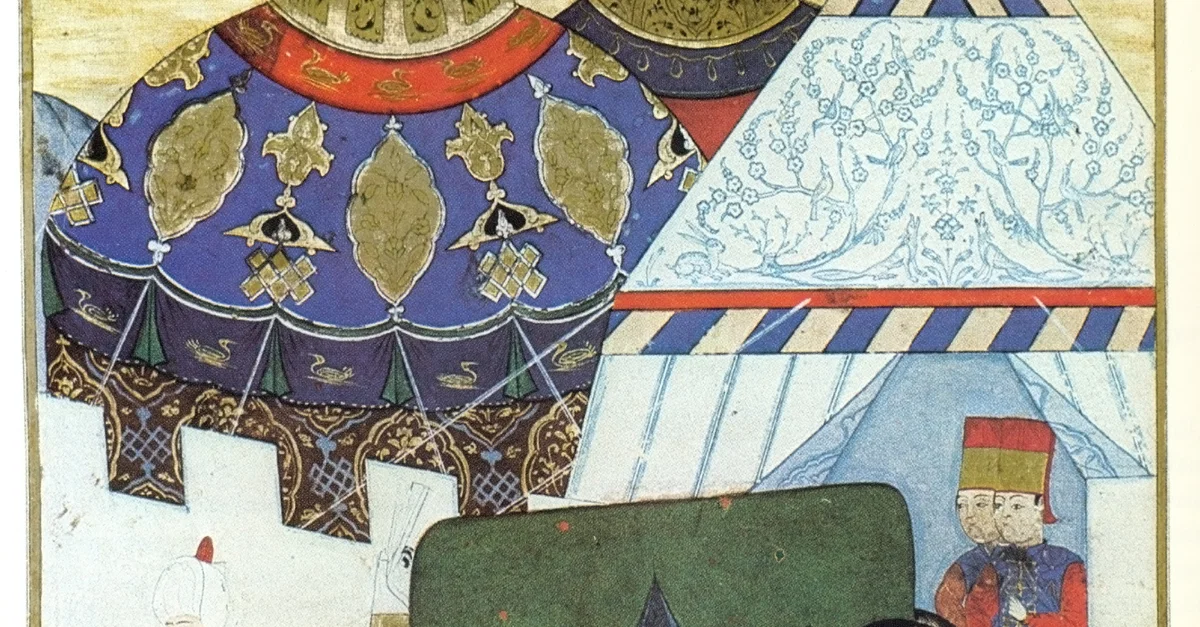 Return of the Turkish army from Szigetvár, feigning that Suleiman I is still alive, double miniature, Hazine 1339, 104a, 16th century.