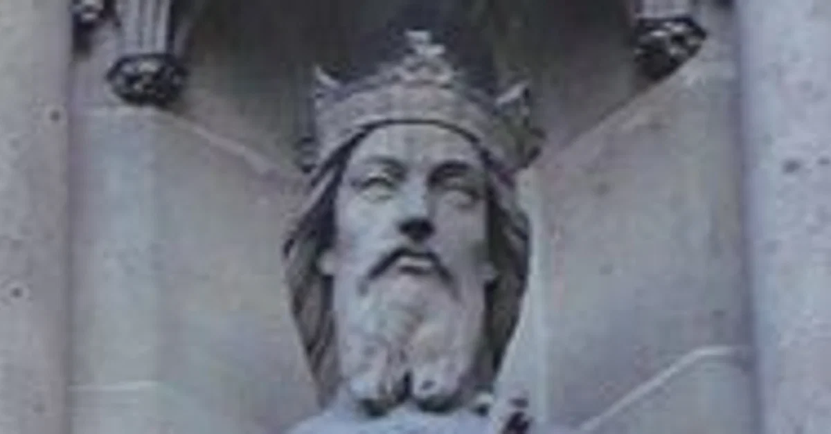 King Guntram I of Orléans (r. 561-592), later statue located on the left part of the entrance to the Basilica of St. Clotilde in Paris.