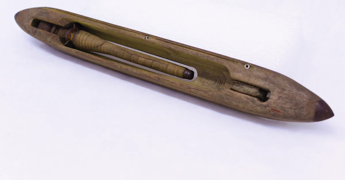 A flying shuttle, used in the textile industry to pull thread (weft) horizontally across longitudinal threads (the warp) on a weaving frame. The device was invented by John Kay in 1733 and greatly speeded up textile production. (Immigration Museum of São Paulo, Brazil)