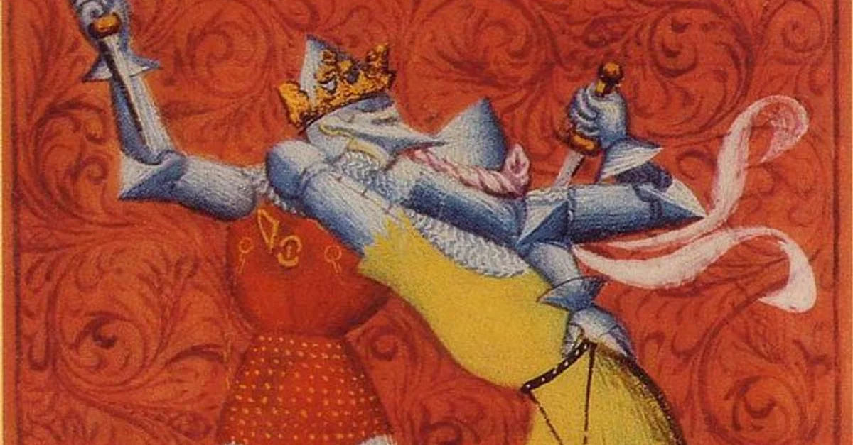 King Chlothar II slays Bertoald, mayor of the palace of Burgundy, during the Battle of Ėtampes, December 604 CE. Illustration from the manuscript Grand Chronicle of France, 14th century.