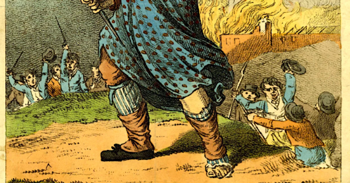 An 1812 illustration showing the mysterious Ned Ludd, leader of the machine-smashing Luddites in early-19th century Britain.