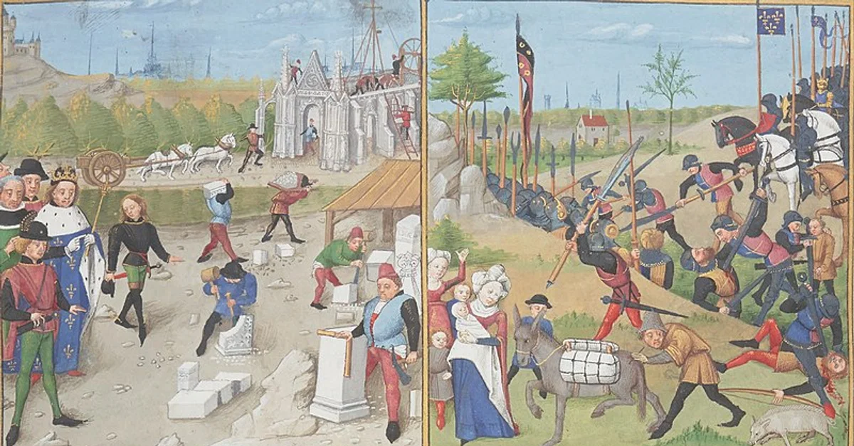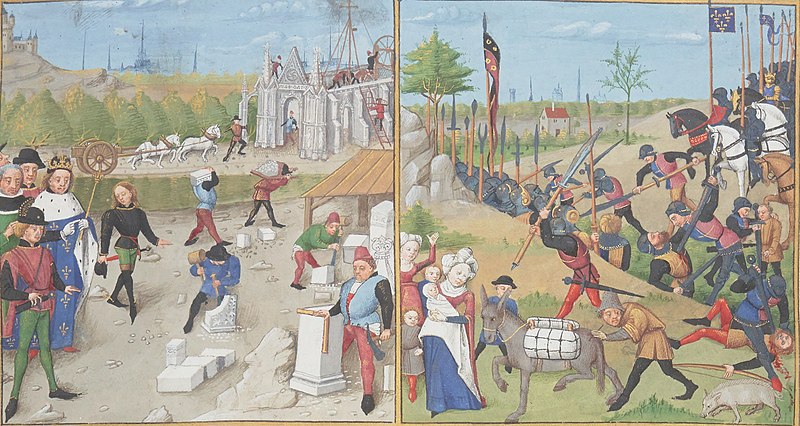 Two depictions of crucial events in the reign of the Merovingian King Dagobert I (r. 623-639): to the left, Dagobert observes the construction of the abbey of Saint Denis Basilica in Paris; on the right, the Frankish army campaigns against Gascon rebels in 635. Illustration from the Grandes Chroniques de France, Français 2609 folio 60 v., Illumination on parchment by Robinet Testard, c. 1471.