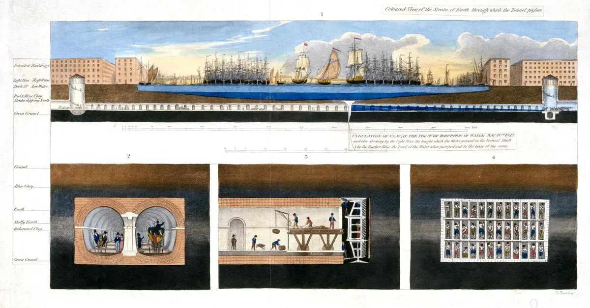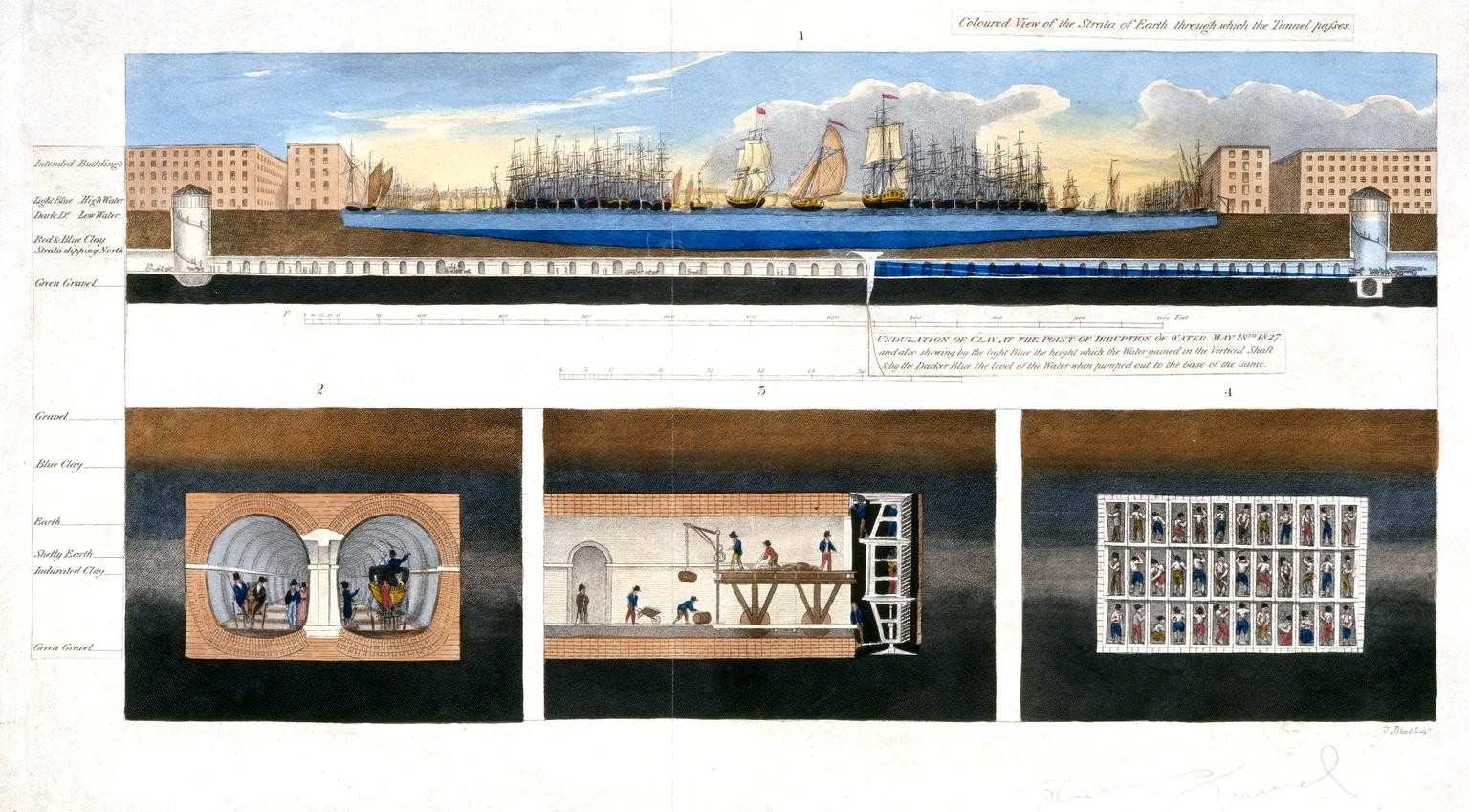 1827 cross-section diagrams by T. Blood of the Thames Tunnel, completed in 1843. (Science Museum, London)