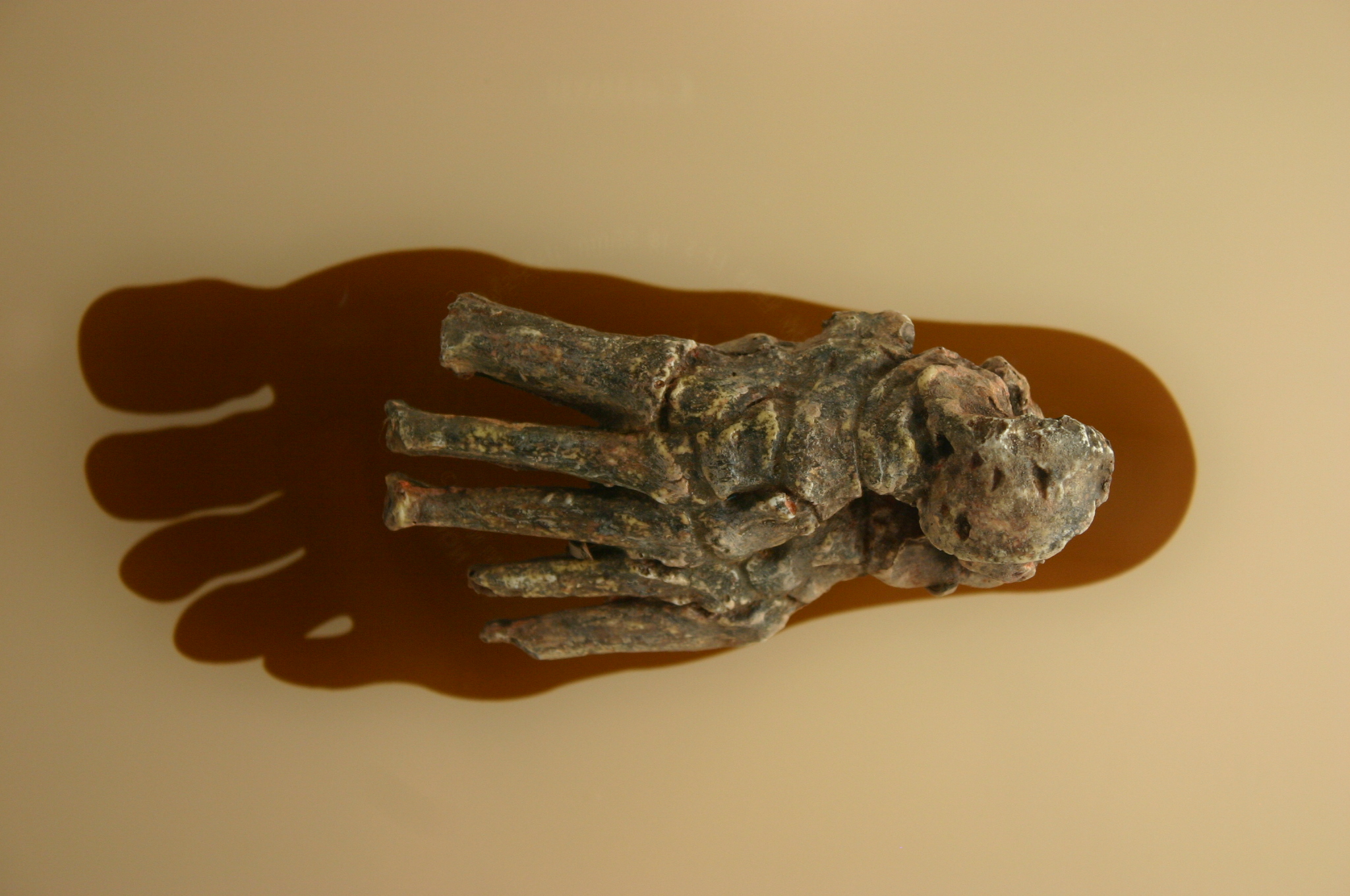 Foot of a Homo habilis individual designated OH 8, found at Olduvai Gorge in Tanzania by Louis and Mary Leakey, probably dating to around 1.8 million years ago. The bones show extensive damage caused by a crocodile – in fact, the whole foot appears to have been bitten off at the heel.