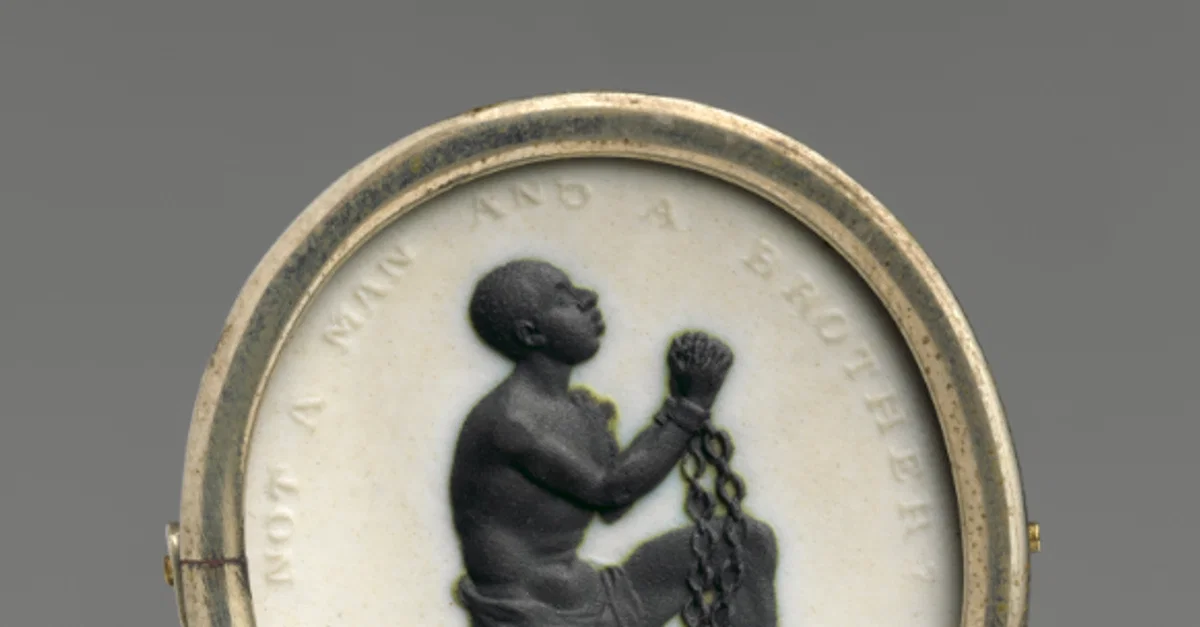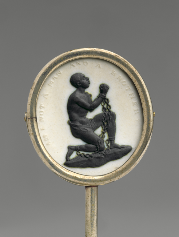The Slave Medallion made by the British potter Josiah Wedgwood to promote the abolition of slavery in 1787. Thousands of medallions were made and given out to supporters of the cause. (Metropolitan Museum of Art, New York)