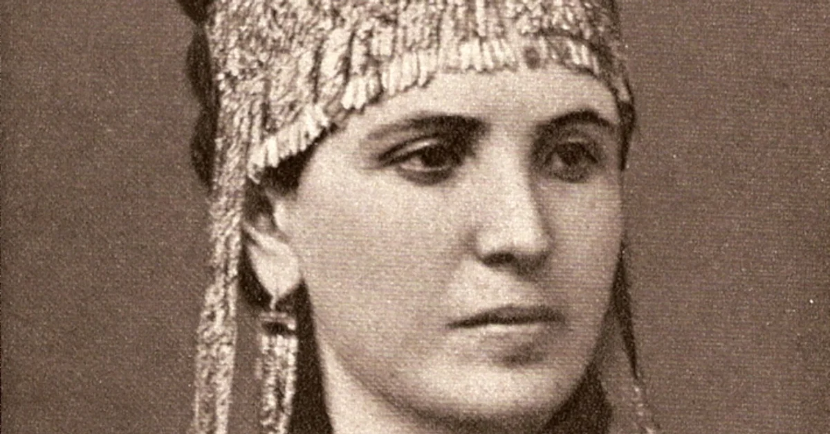 Sophia Schliemann (1852-1932), born Sophia Engastromenou in Athens, Greece, wearing Priam's Treasure (1873). Sophia was the second wife of the German archaeologist Johann Ludwig Heinrich Julius Schliemann (1822-1890), famous for his discovery of Troy.