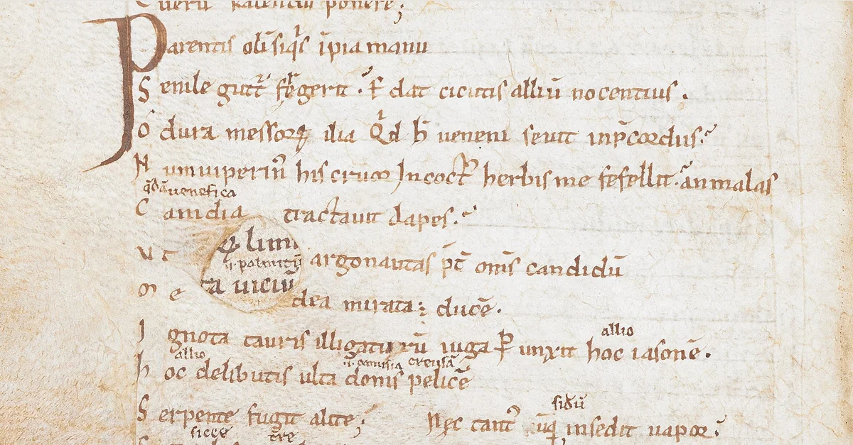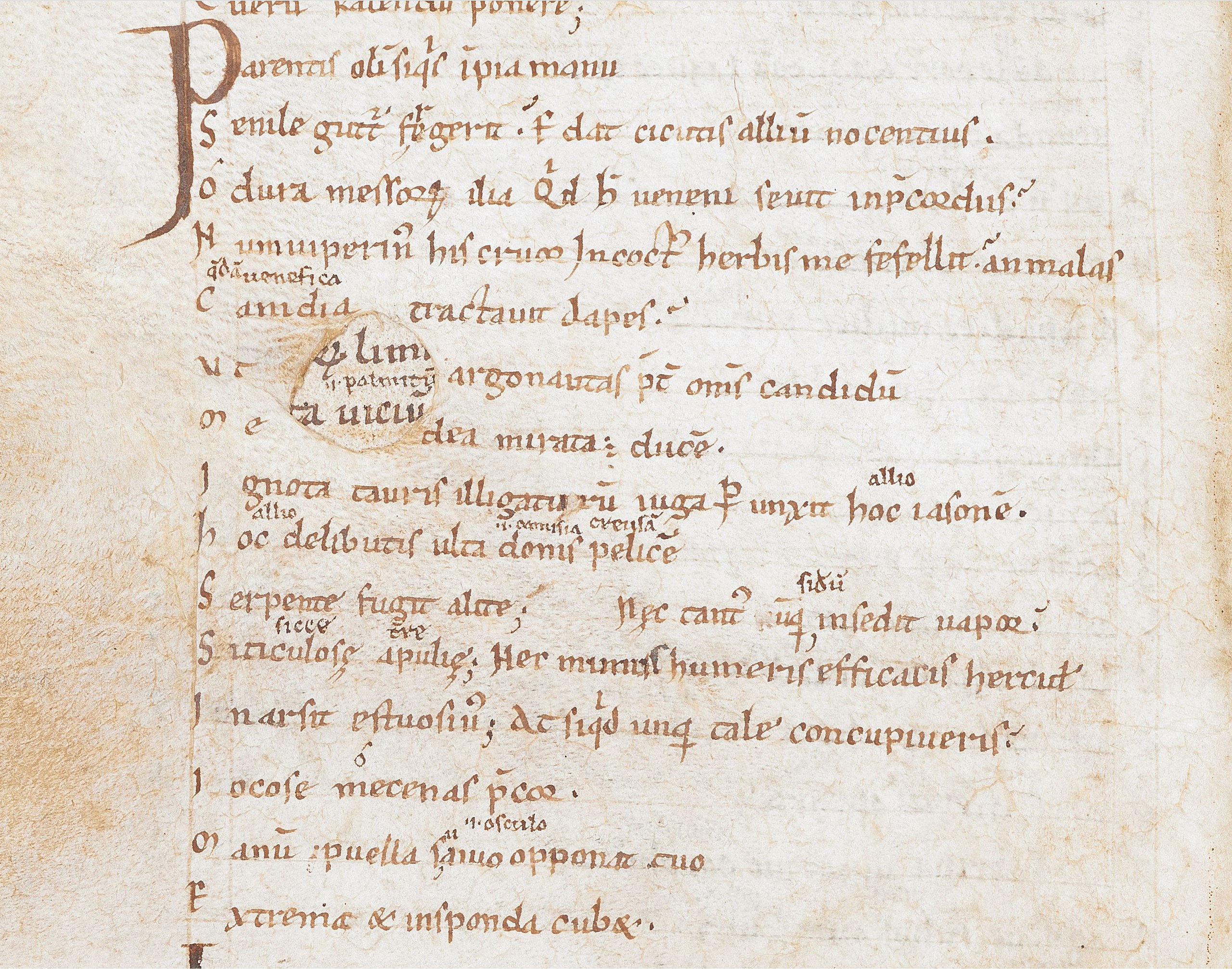 Epodes III by Horace (65-8 BCE), from a 4th quarter of the C12 manuscript of his complete works, Harley MS 3534 f.39v.
