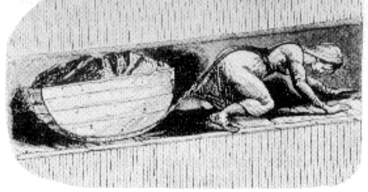 An illustration of a child pulling a tub of coal from the mine face to the surface. Child labour was common in mines in Britain and not restricted until the 1842 Mines Act.