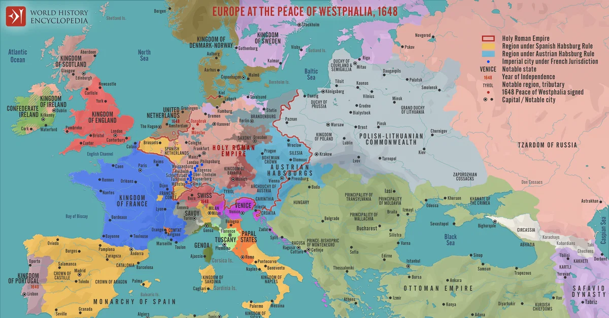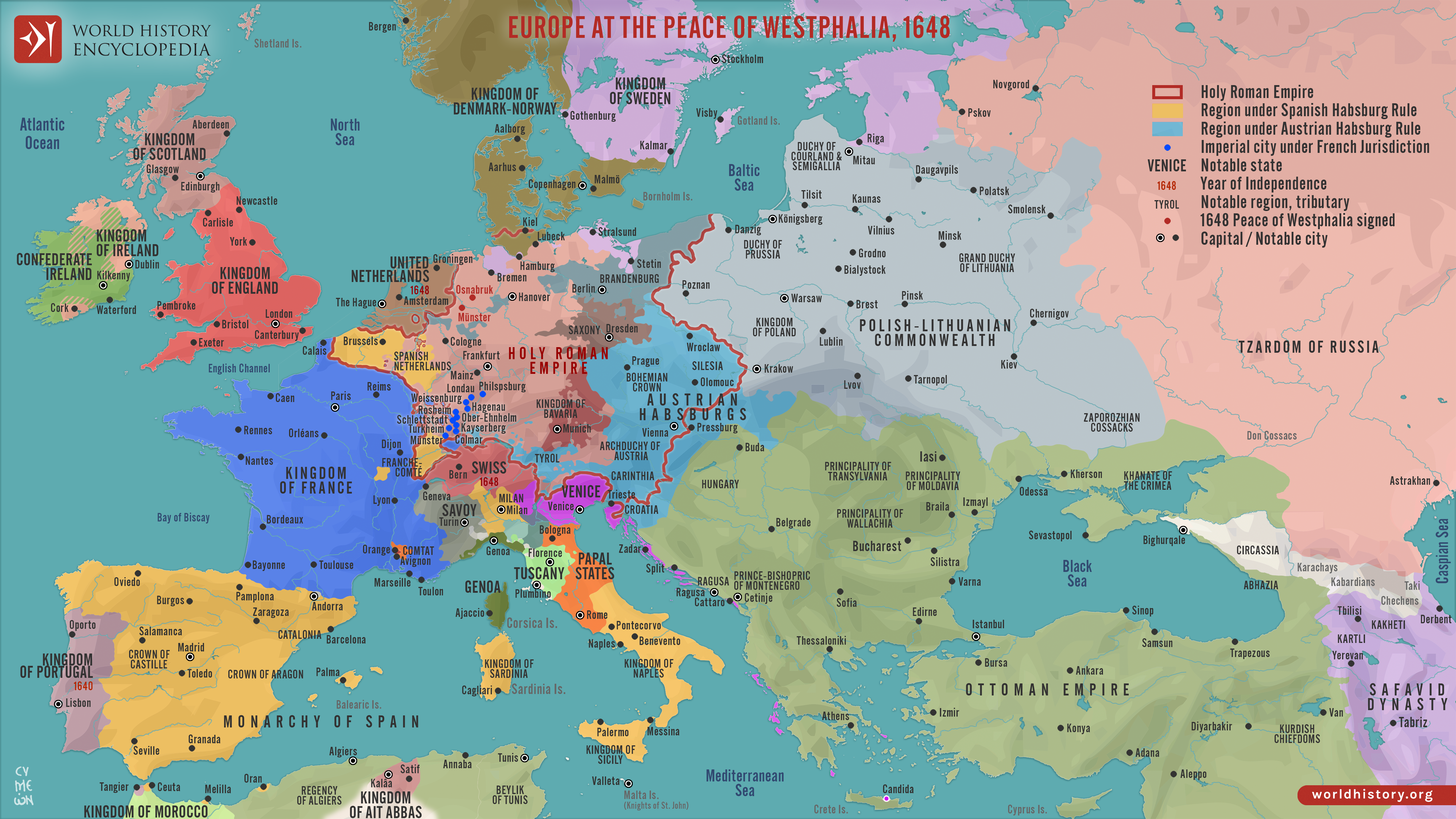 Netchev, S. (2023, March 27). Map of Europe at the Peace of Westphalia, 1648. World History Encyclopedia. https://www.worldhistory.org/image/17228/map-of-europe-at-the-peace-of-westphalia-1648/