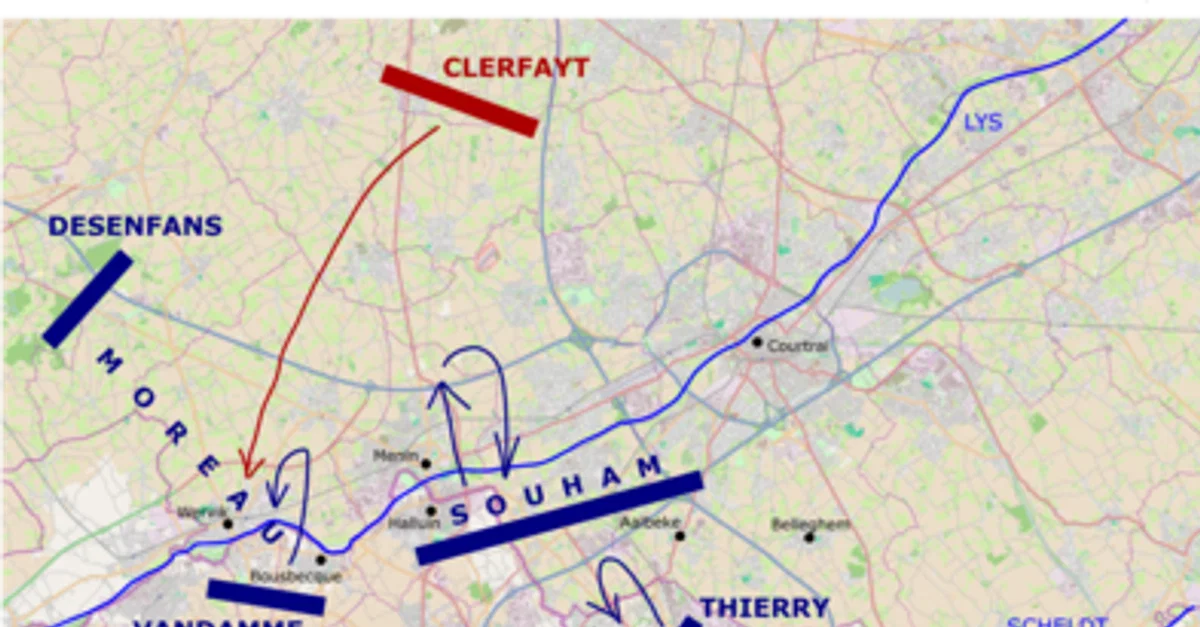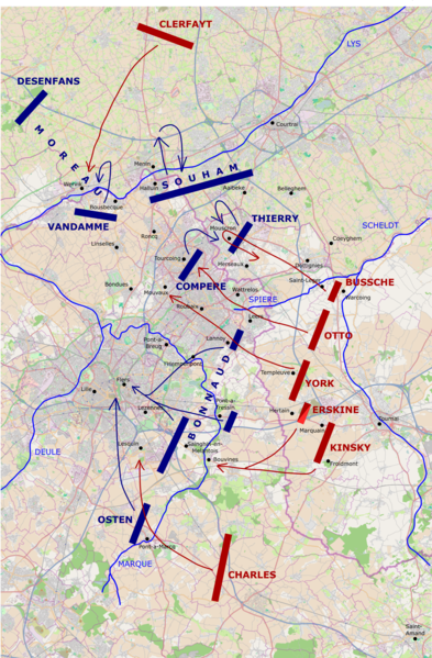 A depiction of the first day of the Battle of Tourcoing, 17 May 1794. Map by Talamioros, 2 January 2022; superimposed on OpenStreetMap.