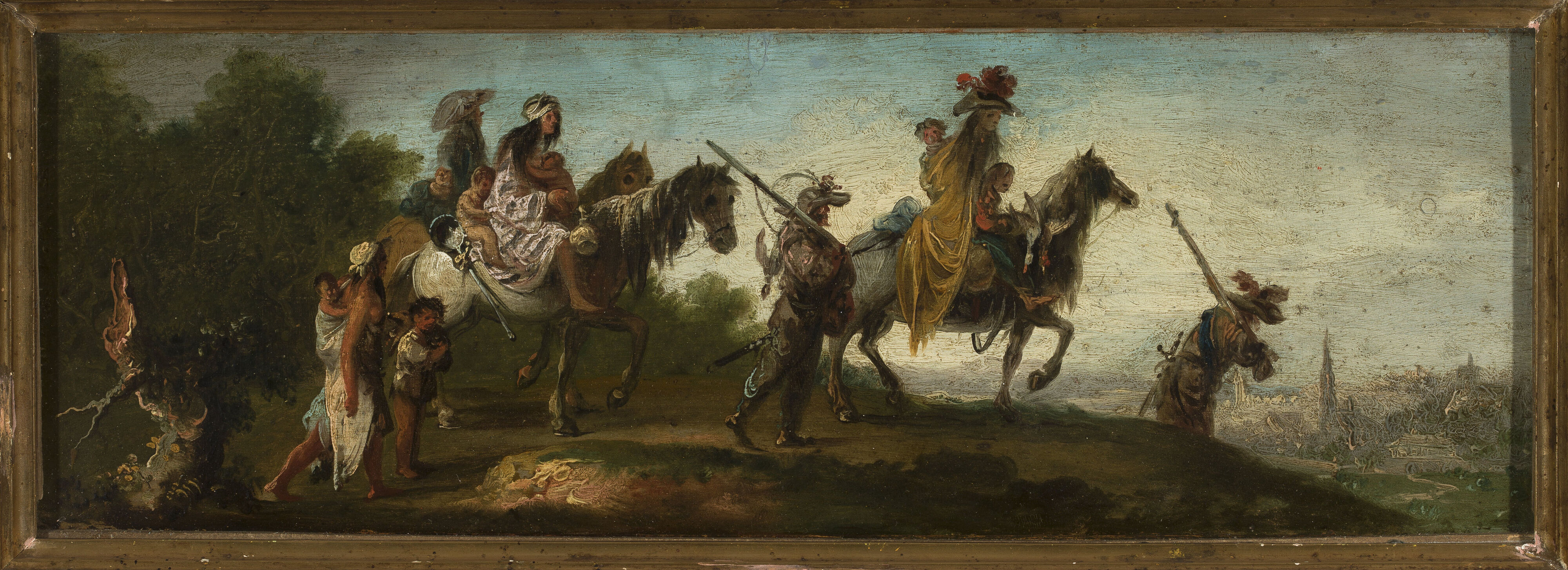 Gypsies on the Road, oil on panel painting by Lorrainian painter Jacques Callot (1592-1635). 16.5 cm (6.4 in) x 47.4 cm (18.6 in).