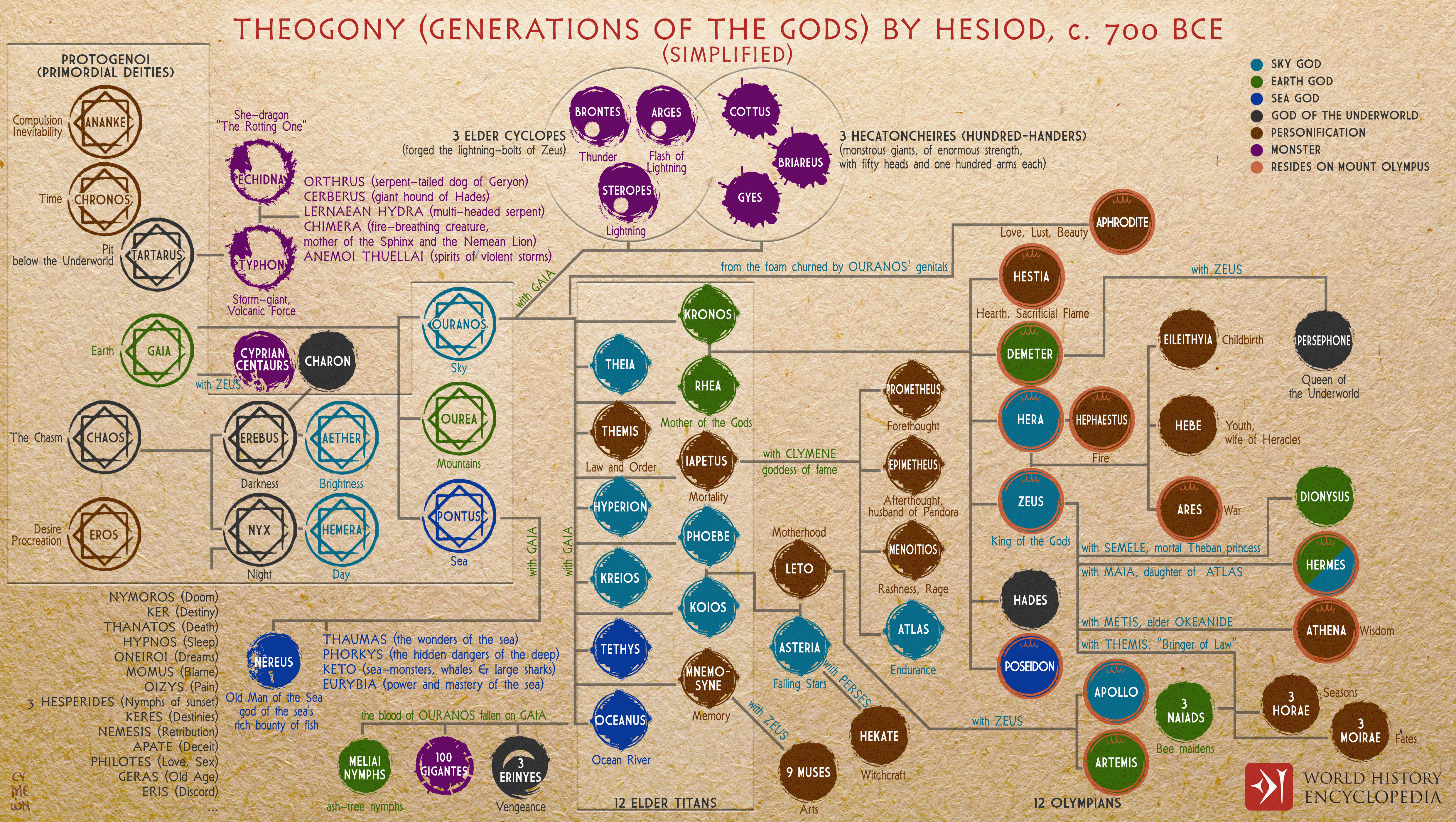 An infographic illustrating Hesiod's Theogony (literally meaning "Birth of the Gods") - the earliest known and the only complete account of the origins of the universe and the gods according to ancient Greek mythology and tradition. Traditionally, Theogony and other works by Hesiod are dated slightly after Homer's (although such relative placement is speculative), around the 8th century BCE. Consisting of about 900 hexametric verses, the poem starts at the very emergence of the cosmos and leads from more abstract entities and forces to anthropomorphic powers and then to a succession of gods locked in power struggles for domination, culminating with the victory of Zeus over the older generations of deities and the imposition of the "current" order of the universe.
