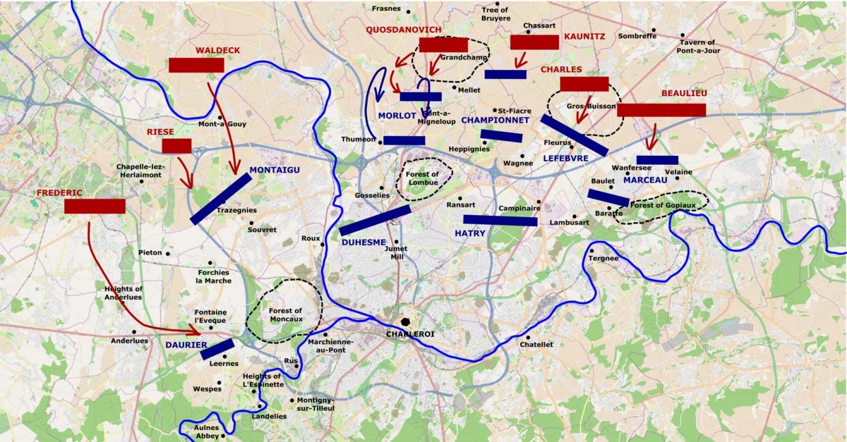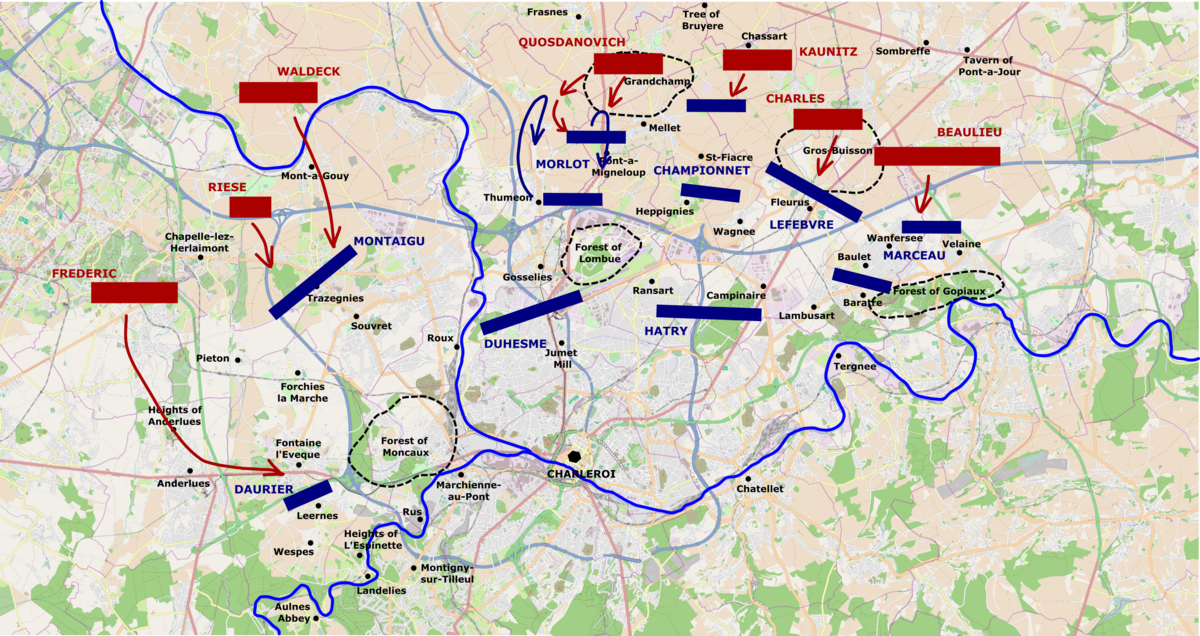 A map depicting the opening maneuvers in the Battle of Fleurus (26 June 1794) from daybreak to 8 a.m. Map by Talamioros, with OpenStreetMap, December 2021.